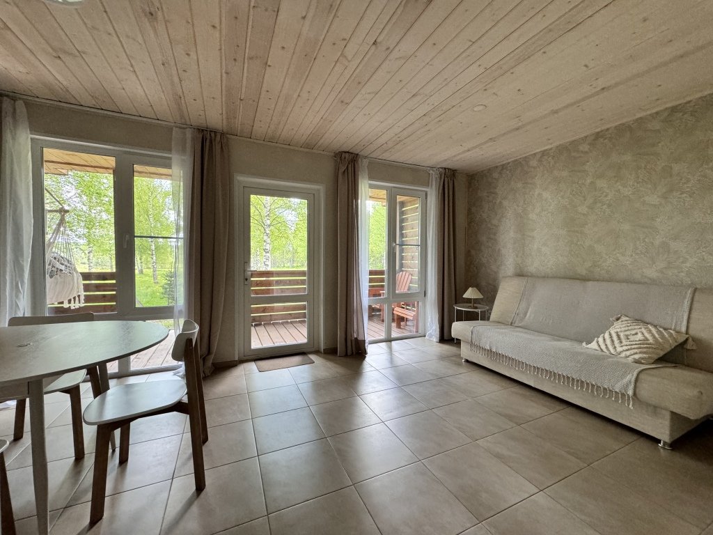 1-й этаж: гостиная с раскладным диваном (140×200 см), кухня с полным набором техники и посуды, санузел.