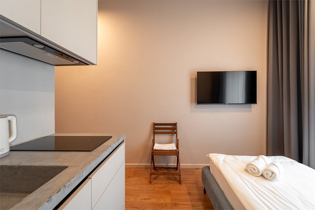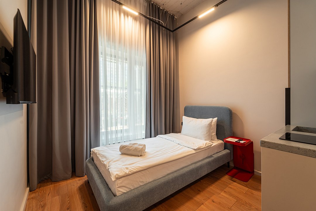 Wi-Fi, кондиционер, фен, электронные замки, плита для приготовления пищи, утюг, санузел, банные принадлежности, тапочки, гигиенические средства, косметические средства, односпальная кровать, шкаф для одежды, зеркало, сейф, чайник, унитаз, раковина, отопление, душ, кухонная посуда, стаканы, кухонная утварь, столовые приборы, стул, мини-холодильник, мини-кухня, телевизор со Smart TV, номер для некурящих, мыло, затемняющая штораВ апартаментах