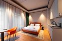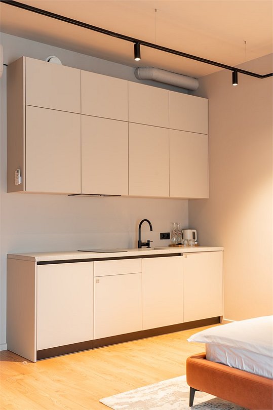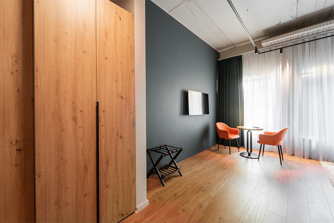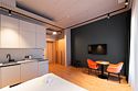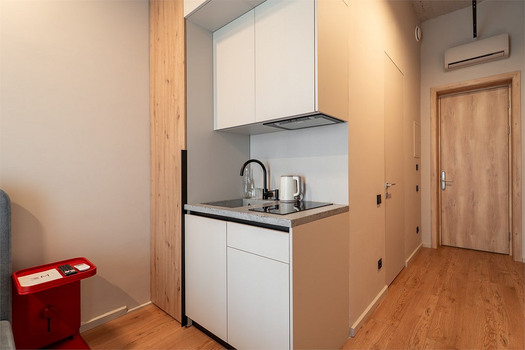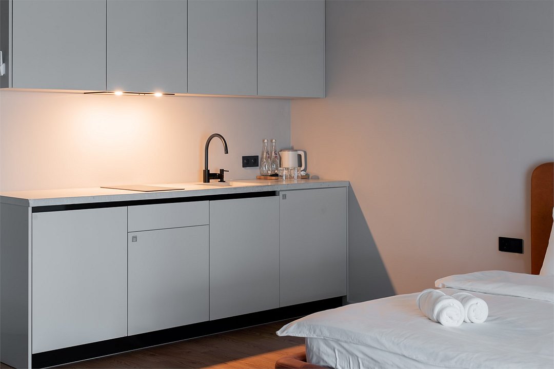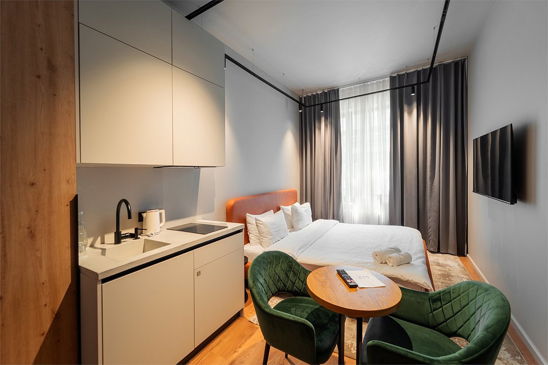 Wi-Fi, кондиционер, фен, электронные замки, плита для приготовления пищи, утюг, банные полотенца, тапочки, гигиенические средства, косметические средства, двуспальная кровать, стулья, шкаф для одежды, зеркало, сейф, чайник, унитаз, раковина, обеденная зона, отопление, душ, окна выходят в атриум отеля, кухонная посуда, стаканы, кухонная утварь, столовые приборы, стол, мини-кухня, телевизор со Smart TV, номер для некурящих, мыло, затемняющая штораВ апартаментах