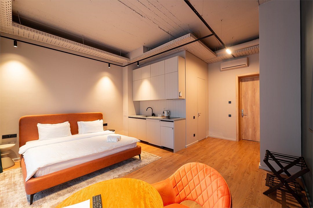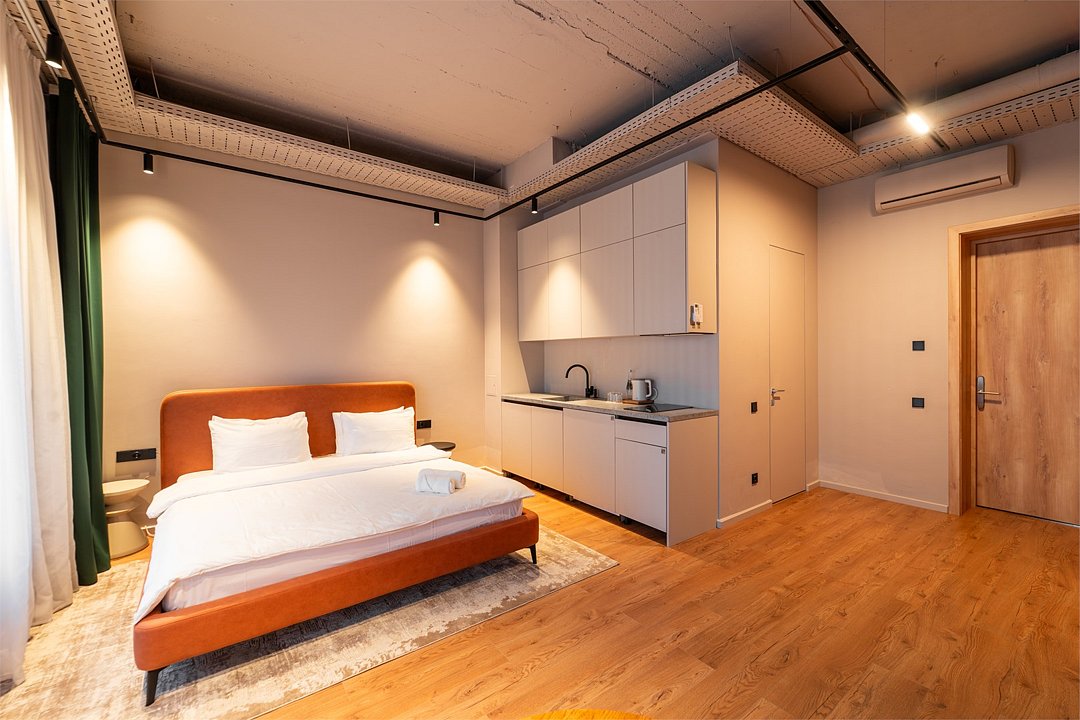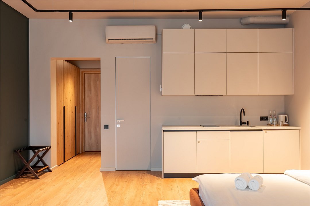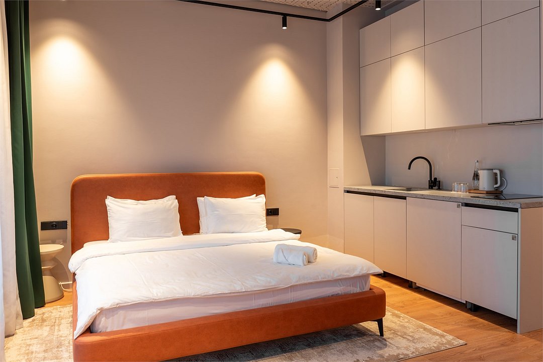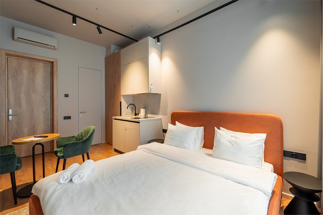 Wi-Fi, кондиционер, фен, электронные замки, плита для приготовления пищи, утюг, банные принадлежности, банные полотенца, тапочки, косметические средства, двуспальная кровать, гладильная доска, стулья, шкаф для одежды, зеркало, набор посуды, сейф, чайник, унитаз, раковина, отопление, душ, кухонная посуда, стаканы, кухонная утварь, столовые приборы, стол, мини-холодильник, мини-кухня, телевизор со Smart TV, номер для некурящих, уборка номера, мыло, затемняющая штораВ апартаментах