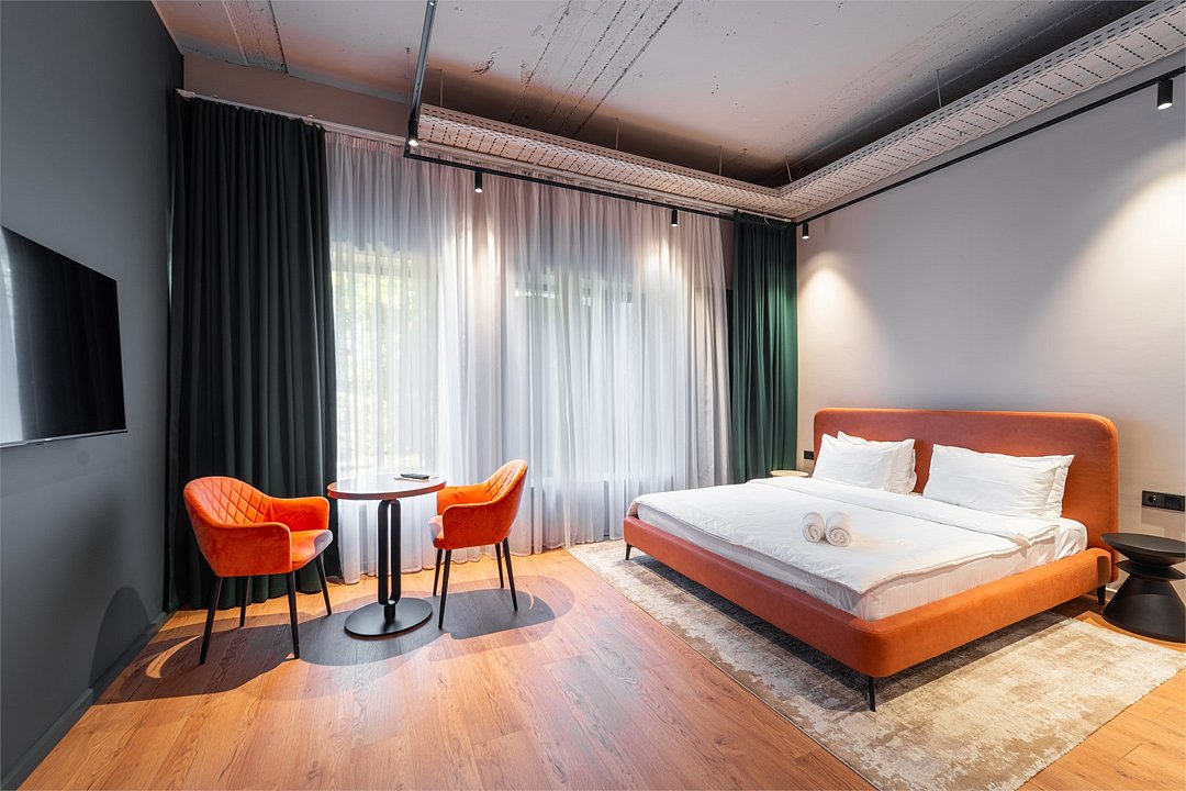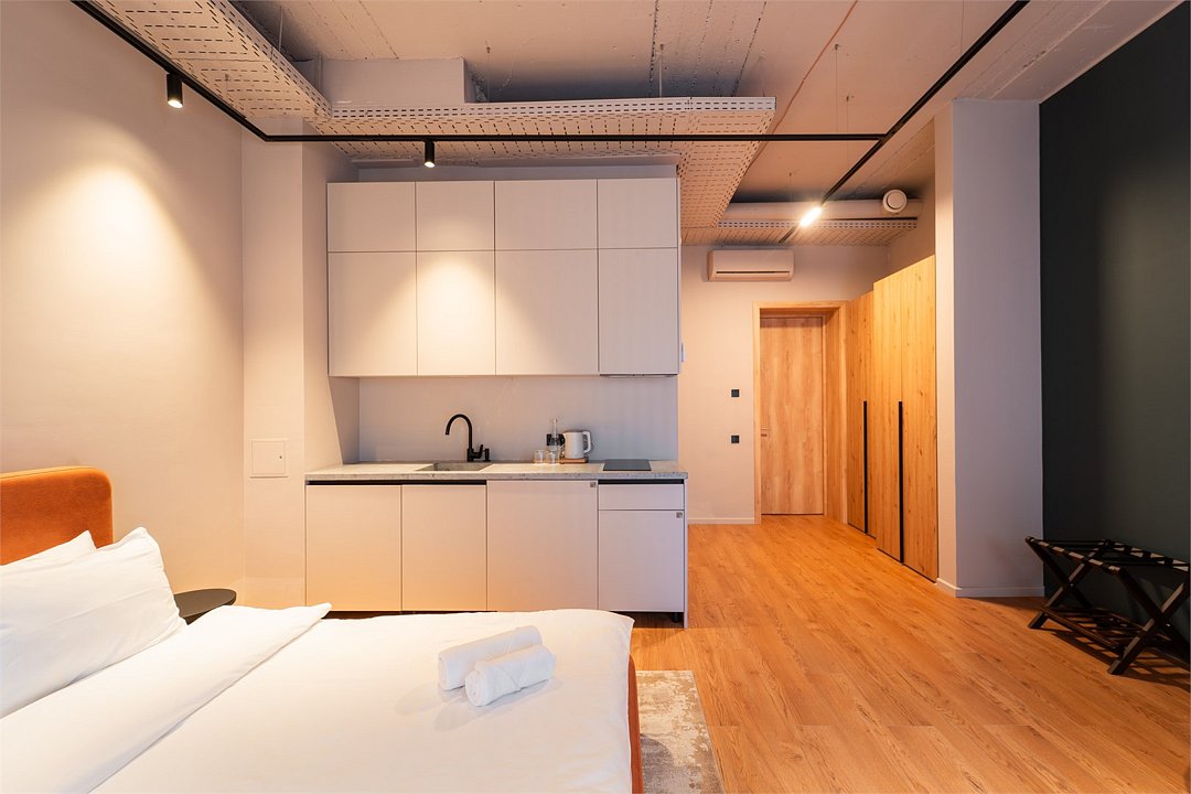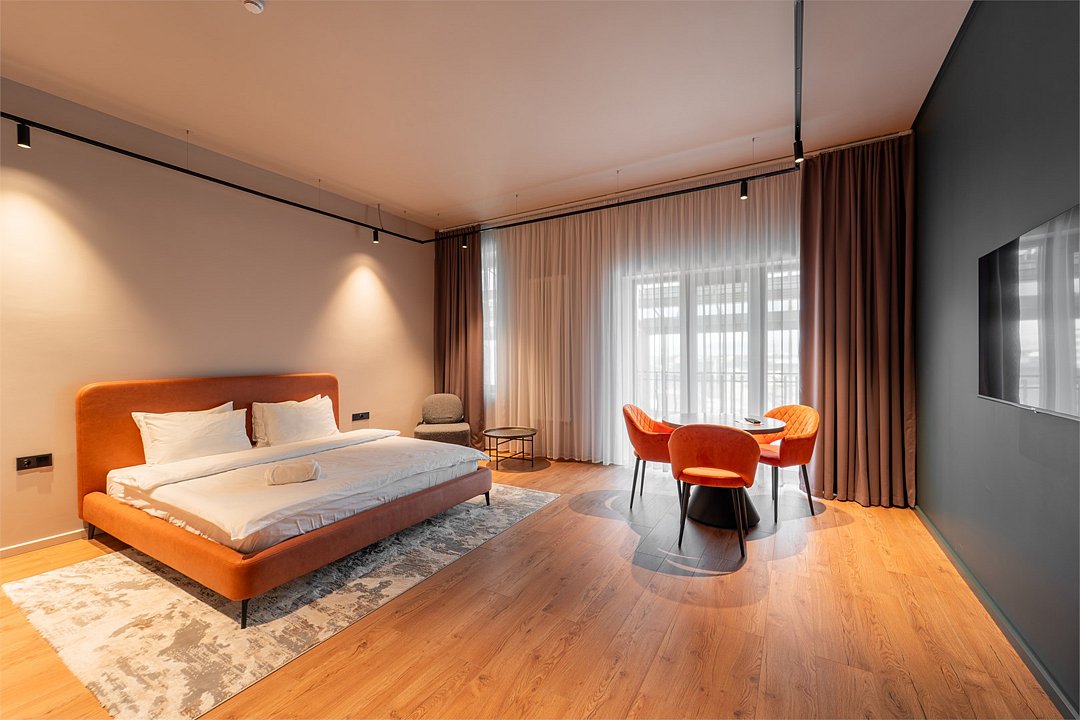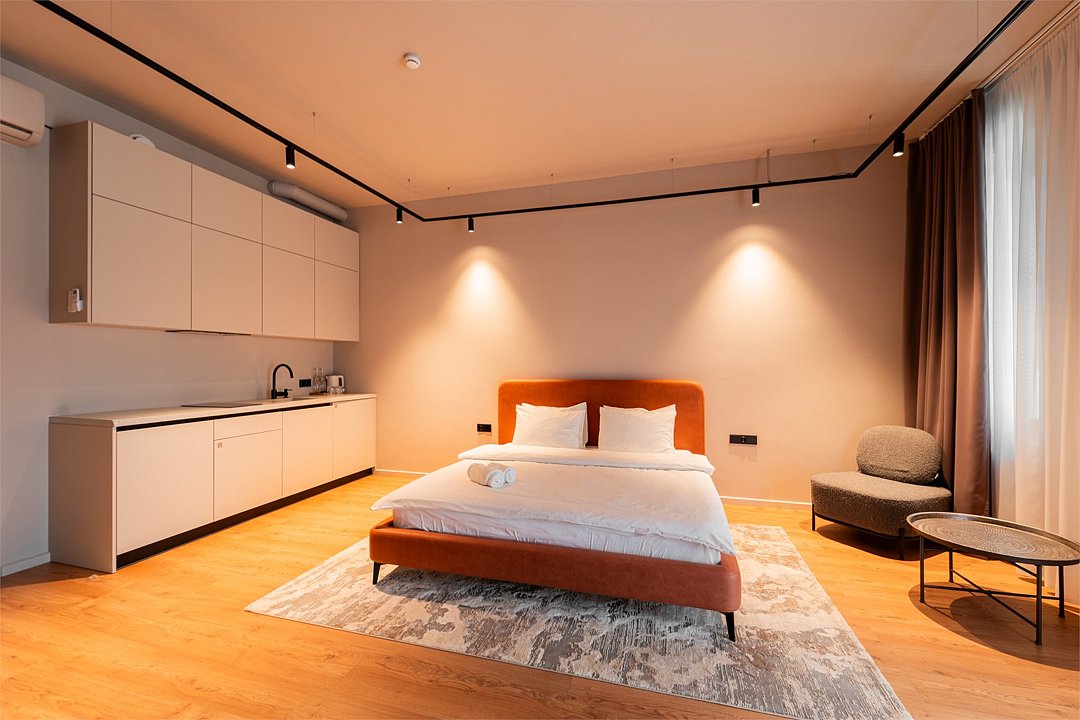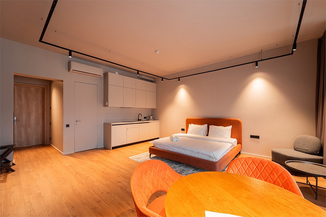 Wi-Fi, кондиционер, фен, электронные замки, плита для приготовления пищи, утюг, банные принадлежности, банные полотенца, тапочки, косметические средства, двуспальная кровать, гладильная доска, стулья, шкаф для одежды, зеркало, набор посуды, сейф, чайник, унитаз, раковина, отопление, душ, кухонная посуда, стаканы, кухонная утварь, столовые приборы, стол, мини-холодильник, мини-кухня, телевизор со Smart TV, номер для некурящих, уборка номера, мыло, затемняющая штораВ апартаментах
