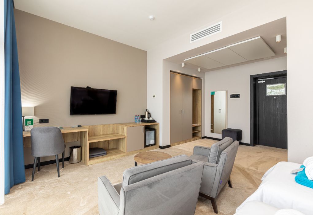Во всех номерах имеется удобная мебель, телевизор, кондиционер, ванная с необходимыми гигиеническими принадлежностями.