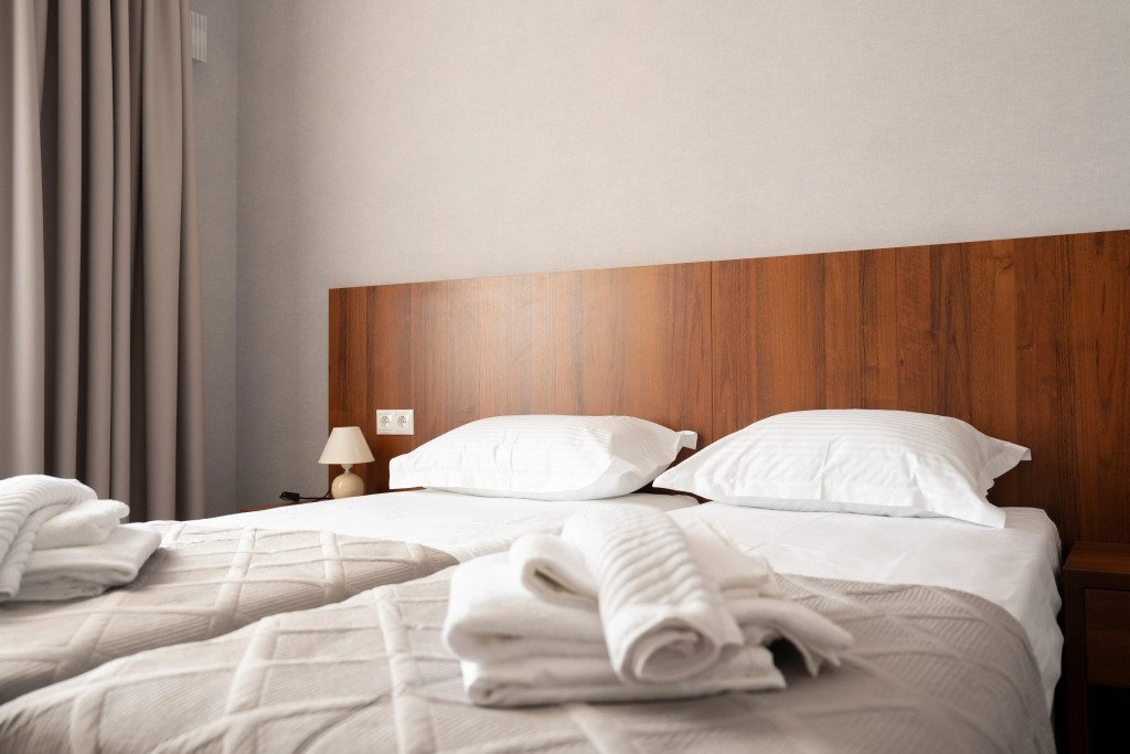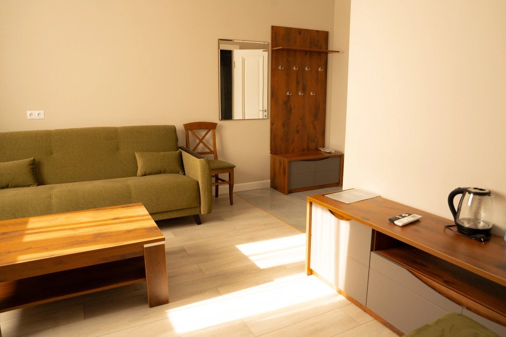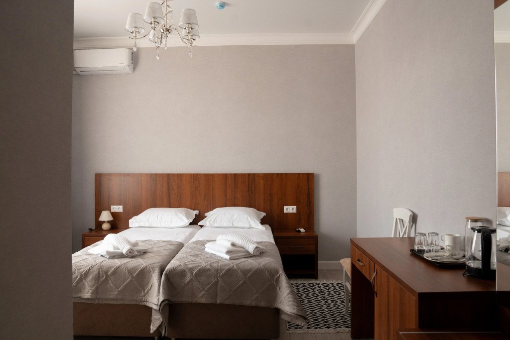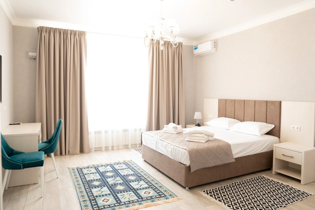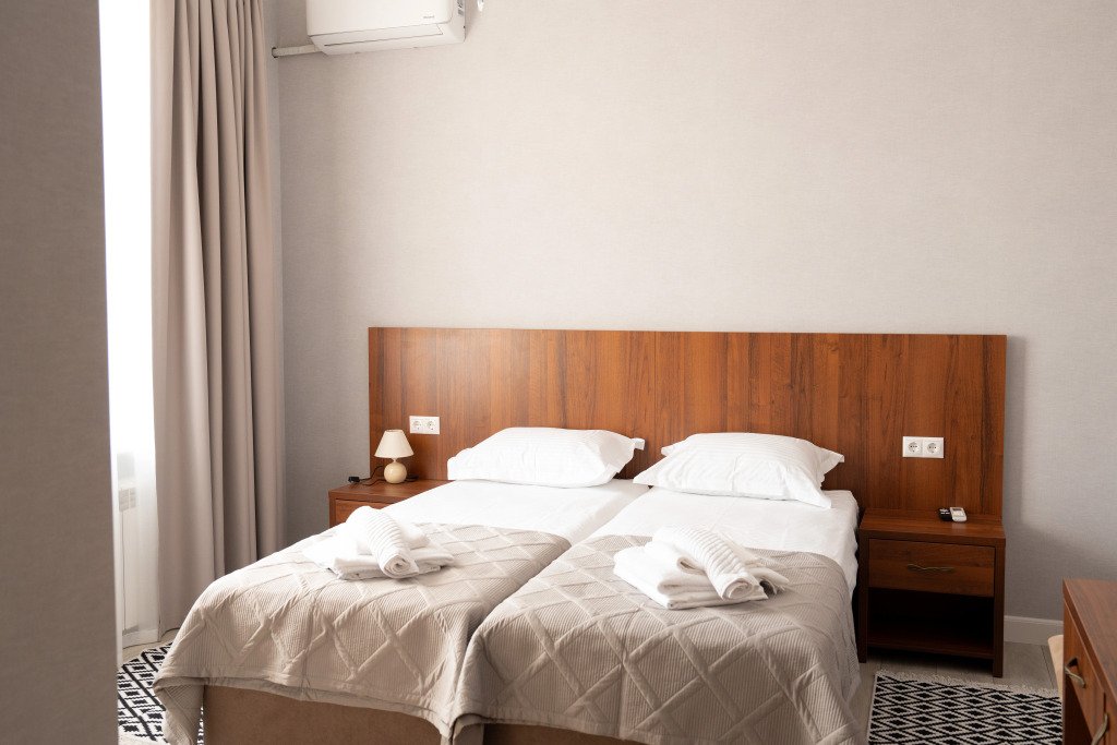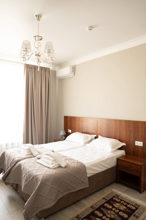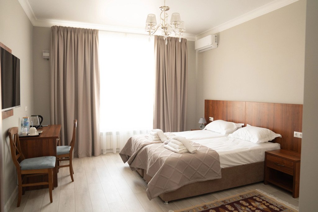 Номер уютно обставлен и оснащён необходимым, чтобы отдохнуть после долгого и насыщенного дня. Имеются телевизор и халат. Оснащение зависит от выбранной категории номера.