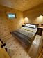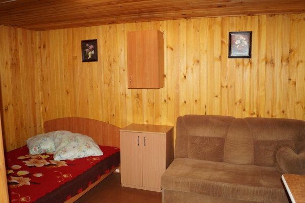 Отдельно стоящий деревянный домик. Дом состоит из двух помещений: прихожая и спальная комната. В спальной: двуспальная кровать, 2 тумбочки, настенный шкаф, стол, стулья, холодильник, телевизор. Туалет и душ на территории б/о. Дополнительное место — раскладная кровать.