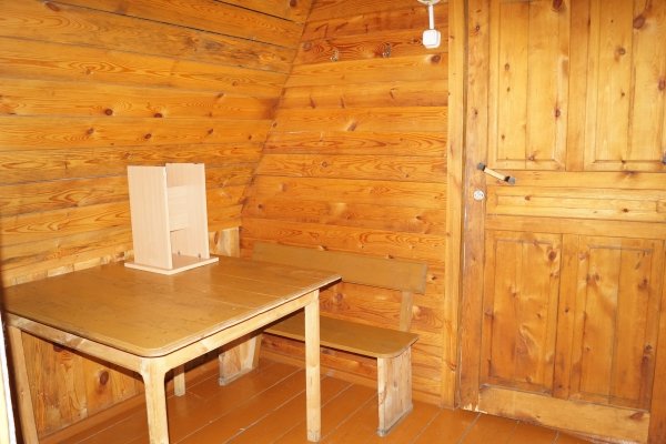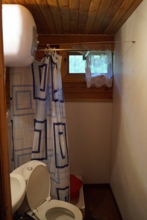 Отдельно стоящий деревянный дом. Состоит из двух помещений: комната и сан.узел. В комнате: 3 односпальные кровати, тумбочки, стол и табуреты, полочки, холодильник, телевизор. В сан.узле: раковина, душ с горячей водой, туалет, зеркало.