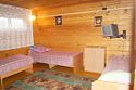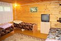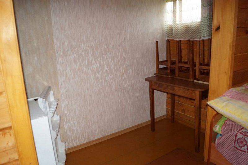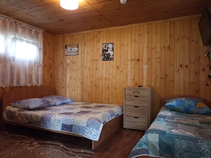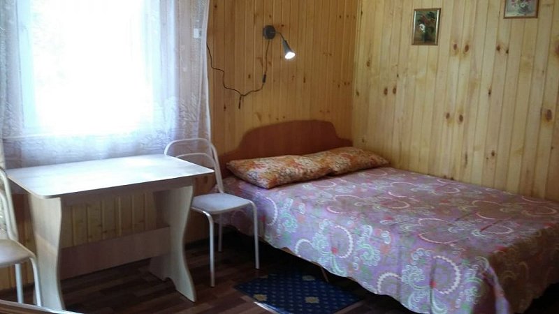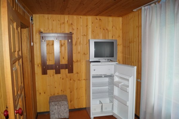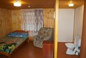Половина отдельно стоящего деревянного дома. Дом на два двухместных номера. Номер состоит из двух помещений: жилая комната и сан. узел. В жилой комнате: две односпальные кровати, стол, стулья, телевизор, холодильник, комод. Дополнительное место — раскладная кровать.