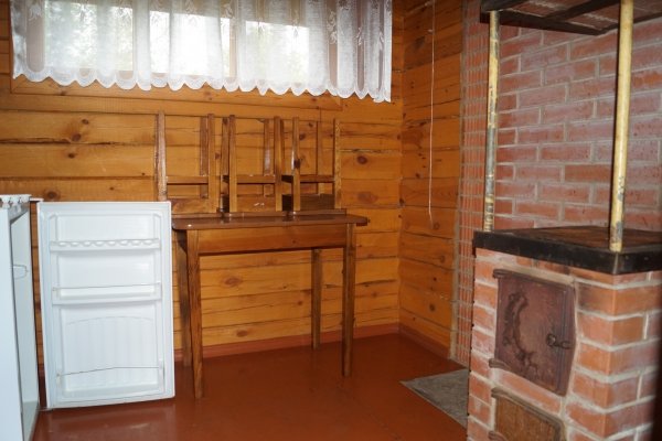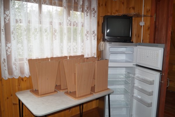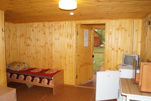 Отдельно стоящий деревянный домик, расположен рядом с домом №12. В доме: три односпальные кровати, тумбочка, стол и стулья, полки, холодильник и телевизор. Туалет, душ и раковина в состав дома не входят, находятся на территории базы отдыха.