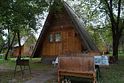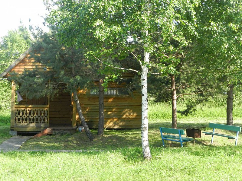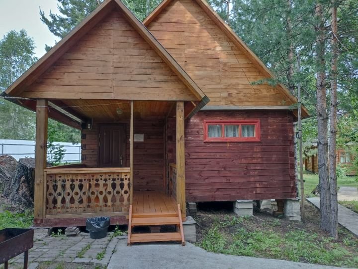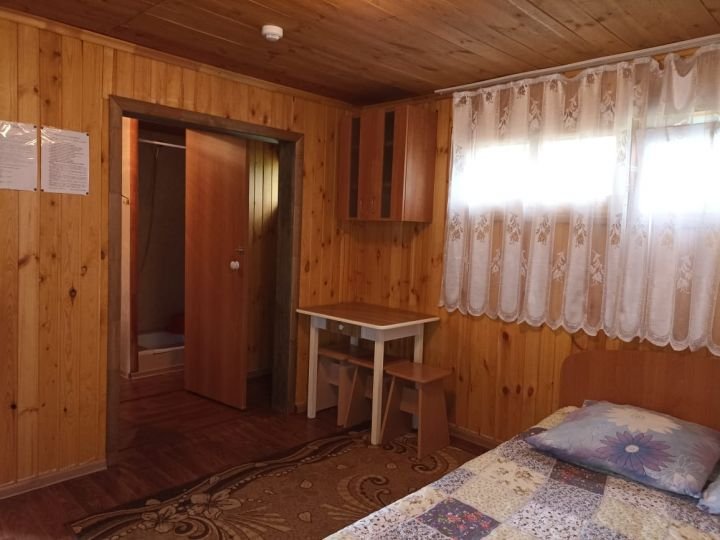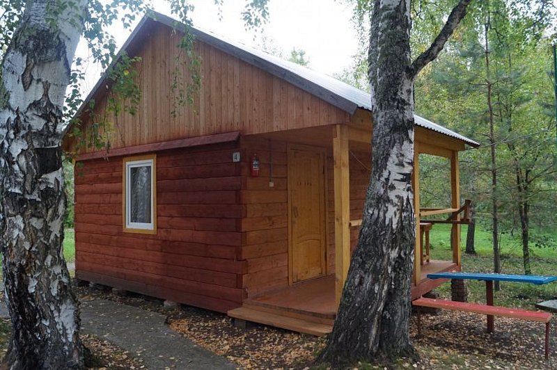 Отдельно стоящий деревянный домик. В доме: двуспальная кровать, тумбочка, стол и табуреты, зеркало, полки, холодильник и телевизор. Туалет, душ и раковина в состав дома не входят, находятся на территории базы отдыха.