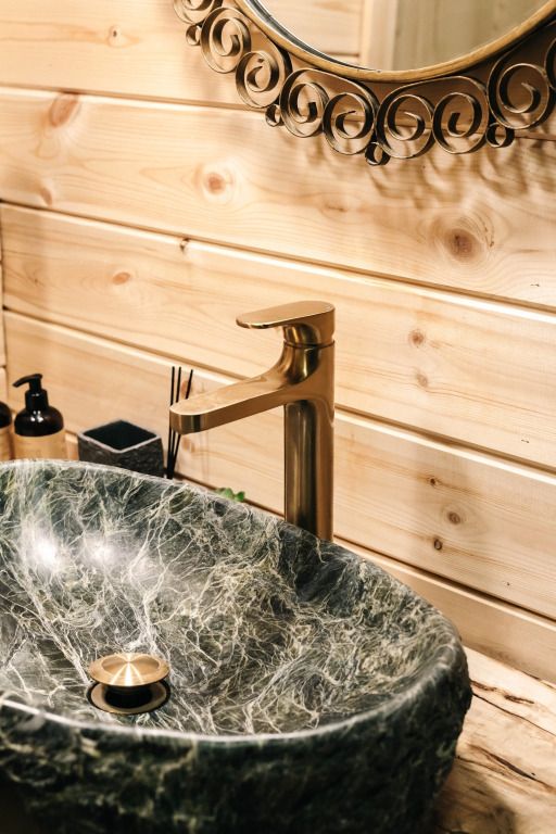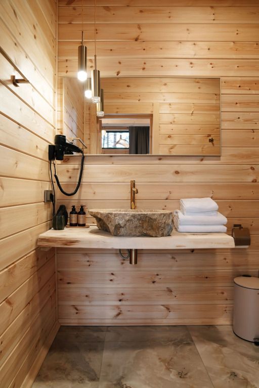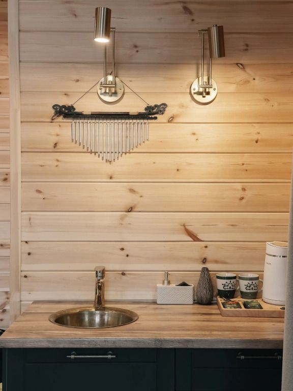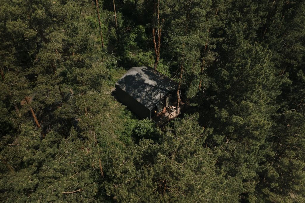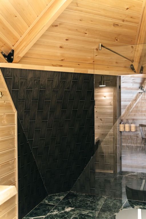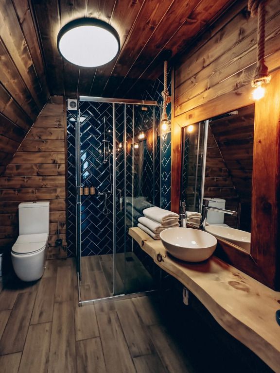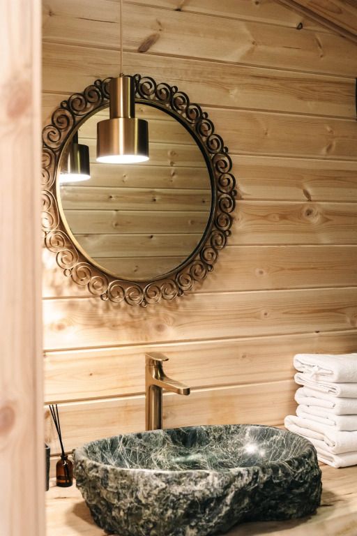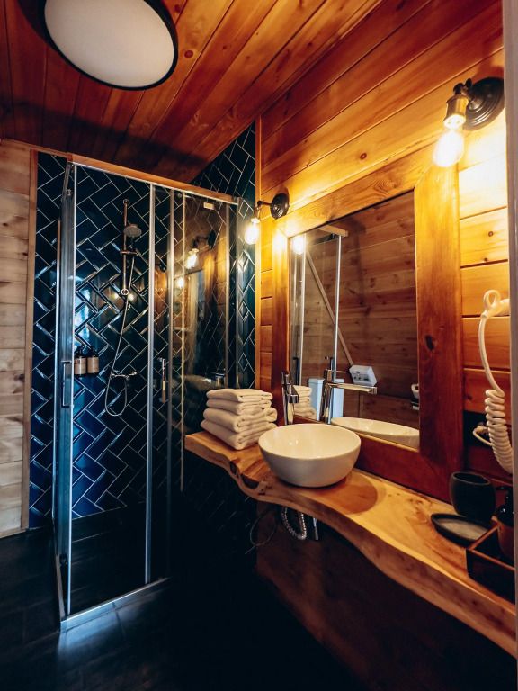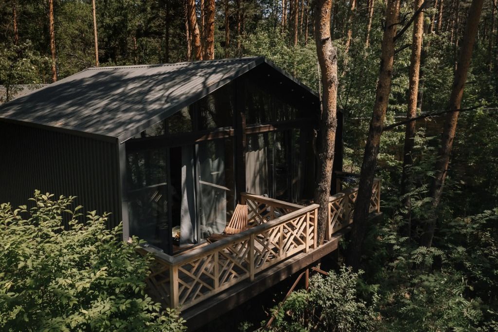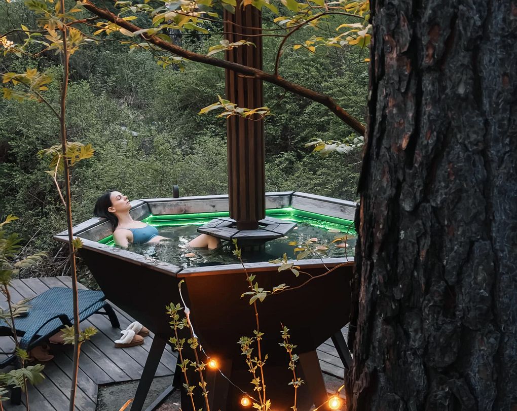 Баня с еловой качелью и горячим чаном в лесу