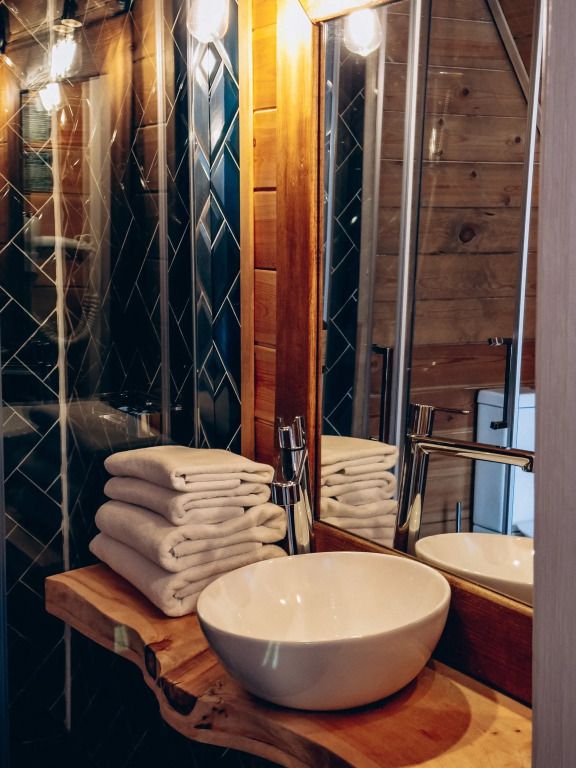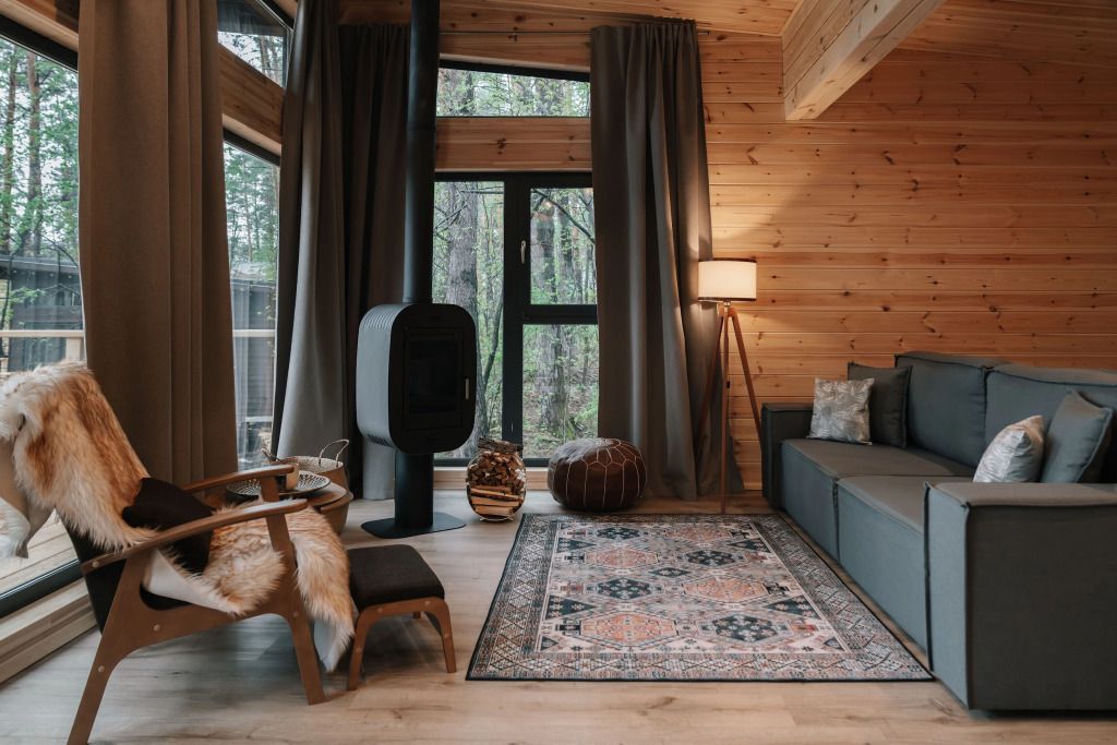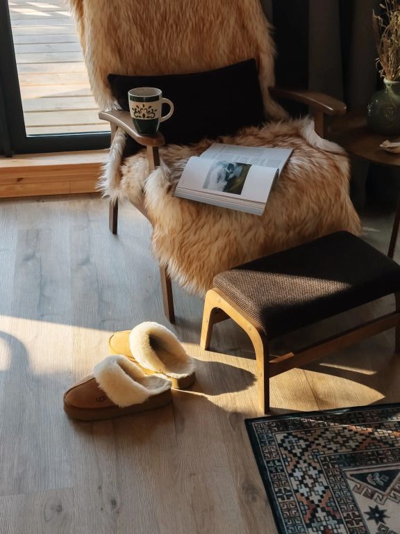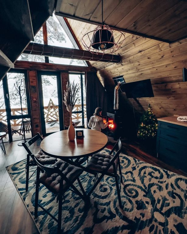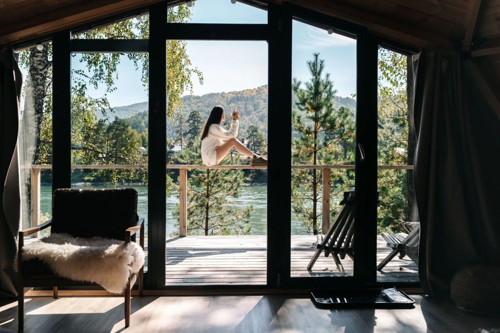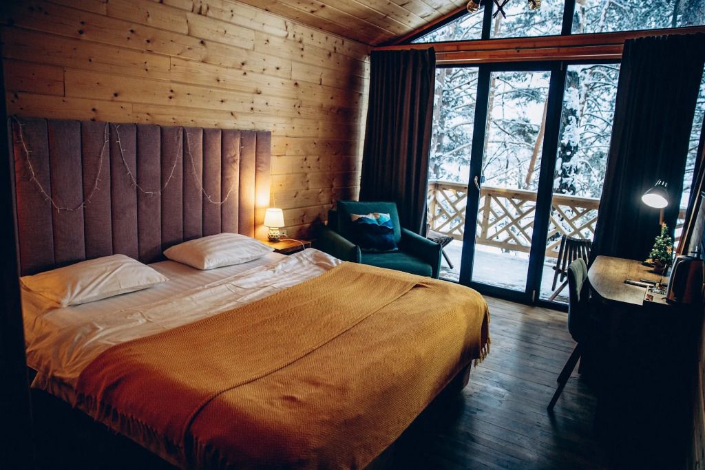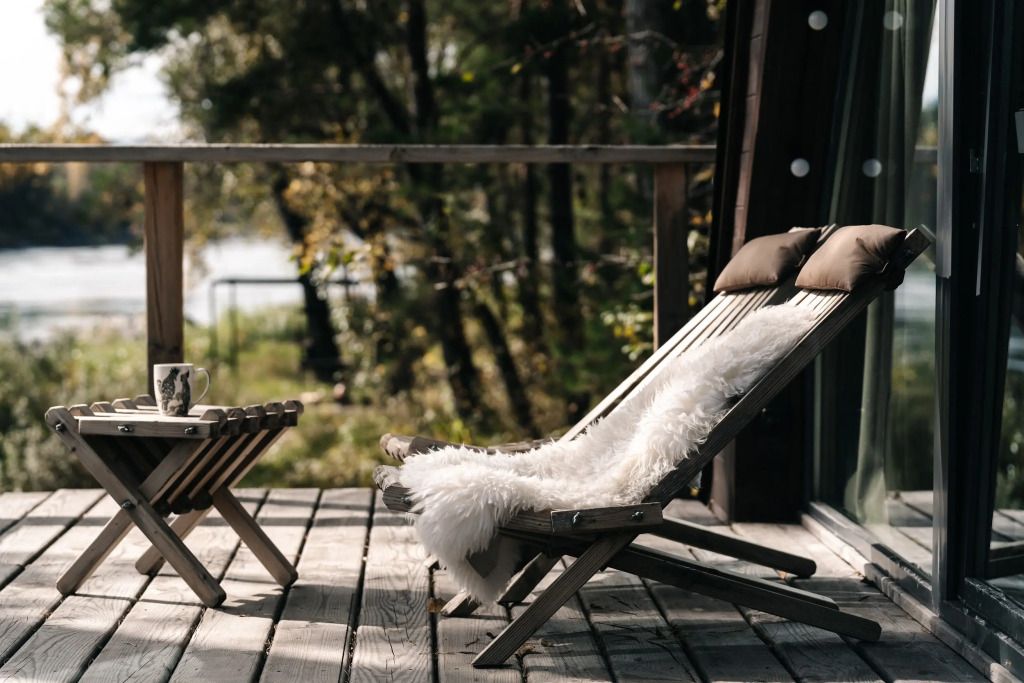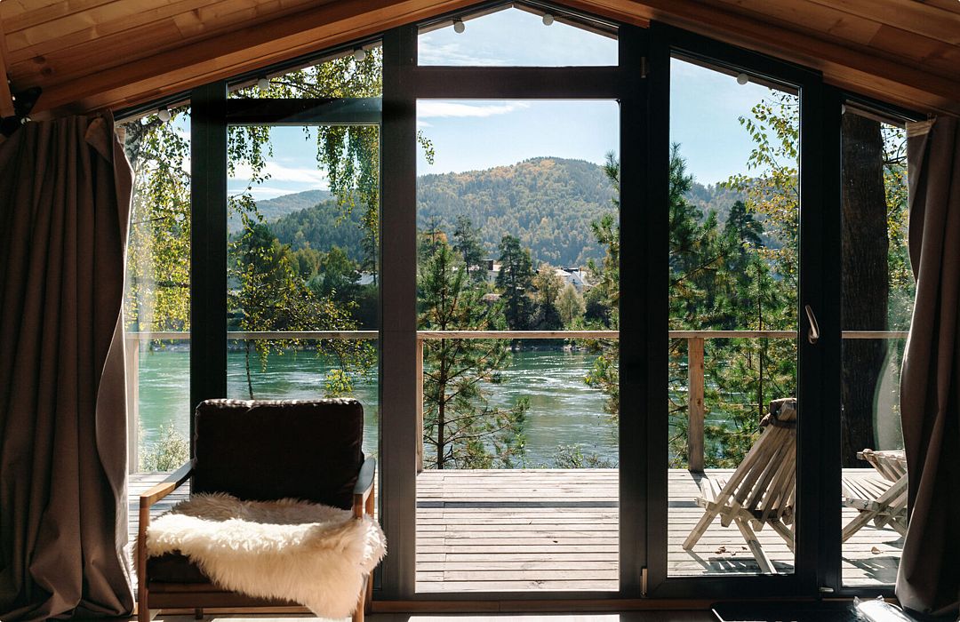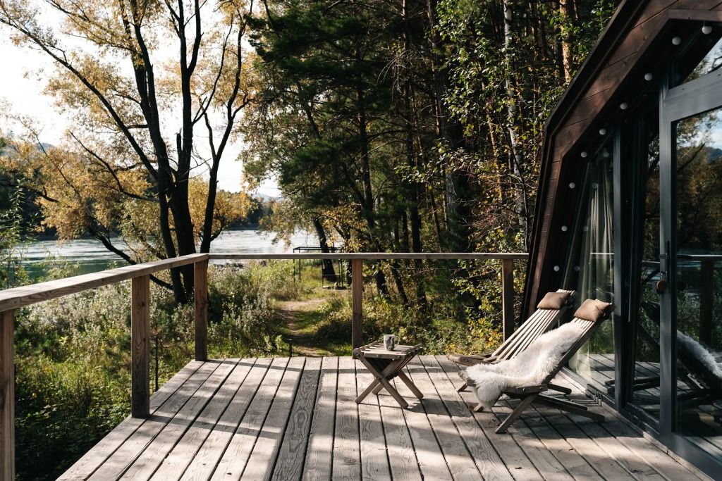 У каждого дома есть личная терраса с удобными креслами и шикарным видом на реку и горы. На некоторых террасах также установлены камины и очаги с безлимитным количеством дров.