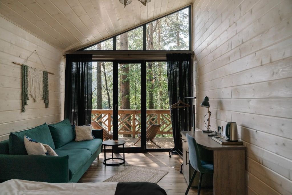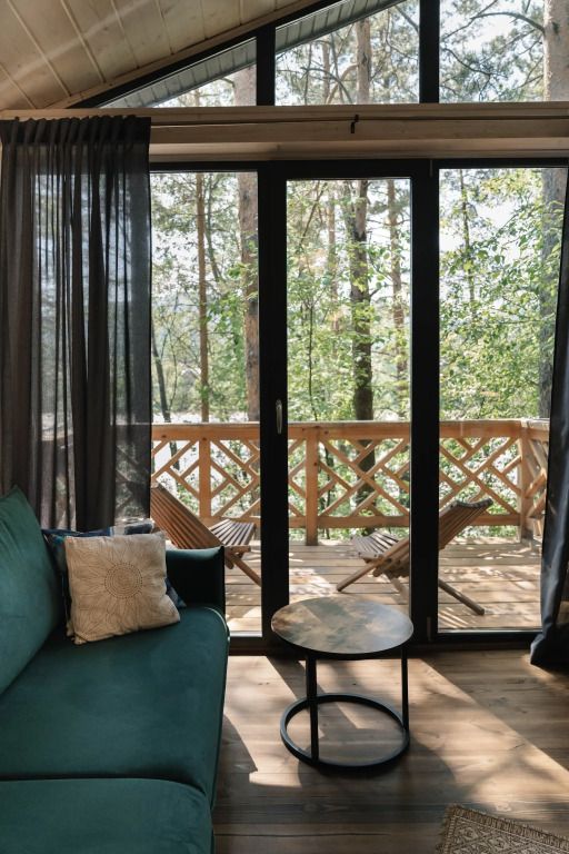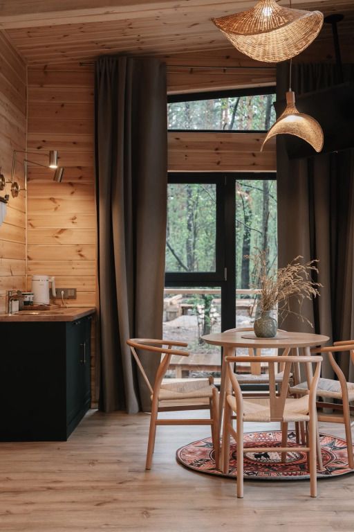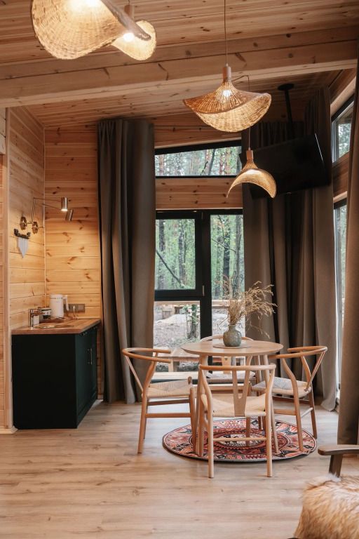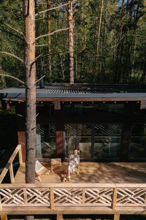 - уютная зона отдыха с панорамным остеклением и видом на сосновый бор;