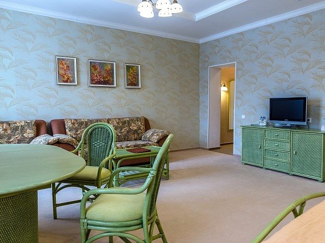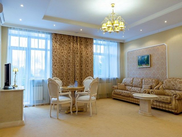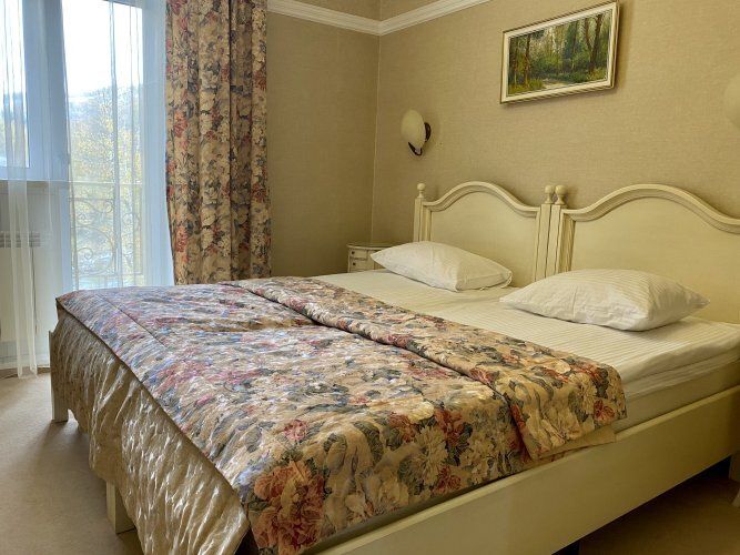 Изысканный классический интерьер, просторный двухкомнатный номер с гостиной, видом из окна на горы и реку. В номере двуспальная кровать и диван или две односпальные кровати и диван. При бронировании можно указать предпочтения.Услуги и удобства
