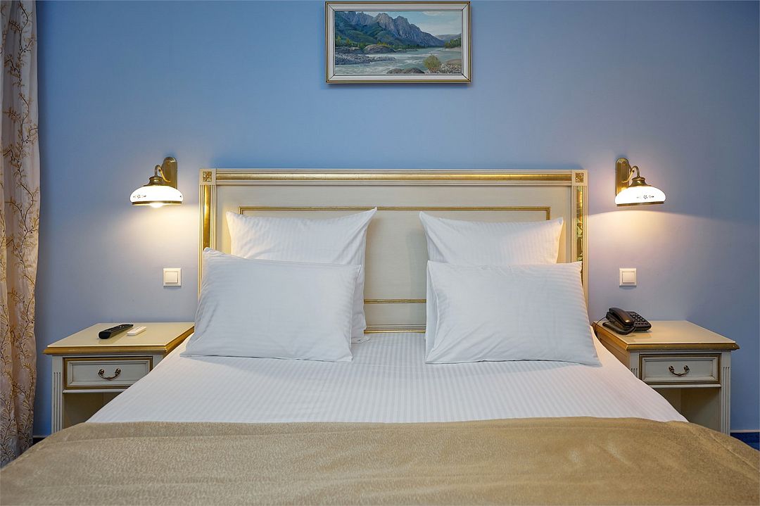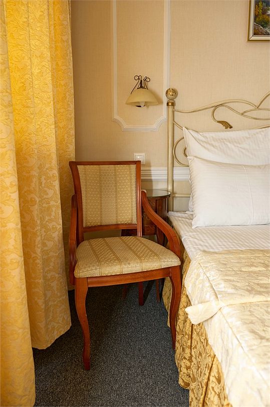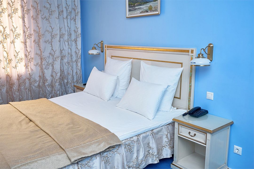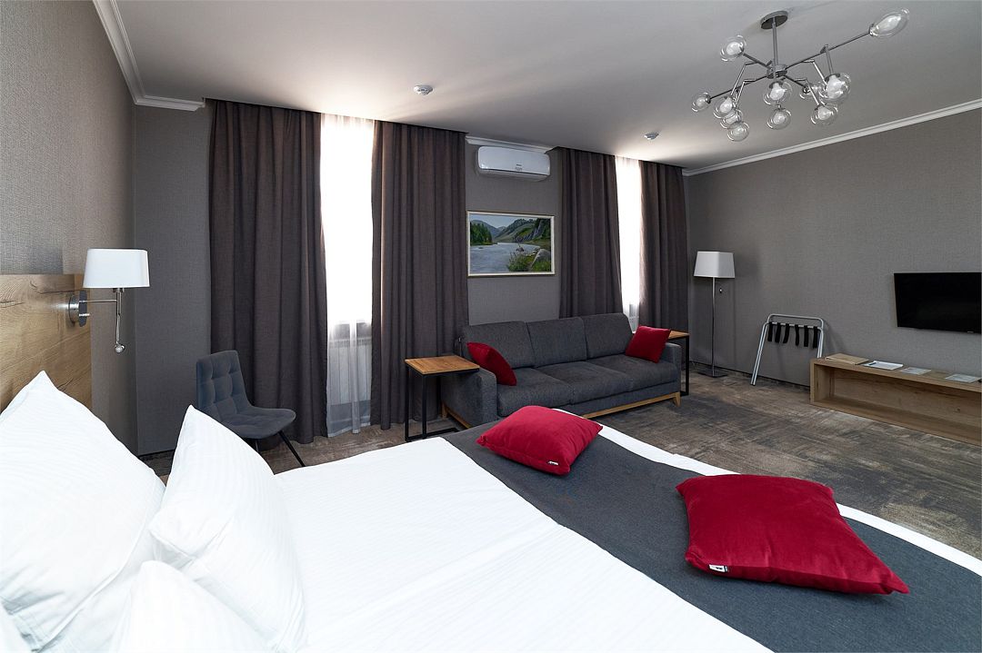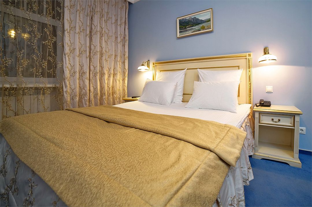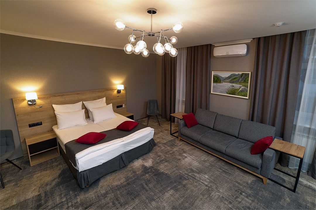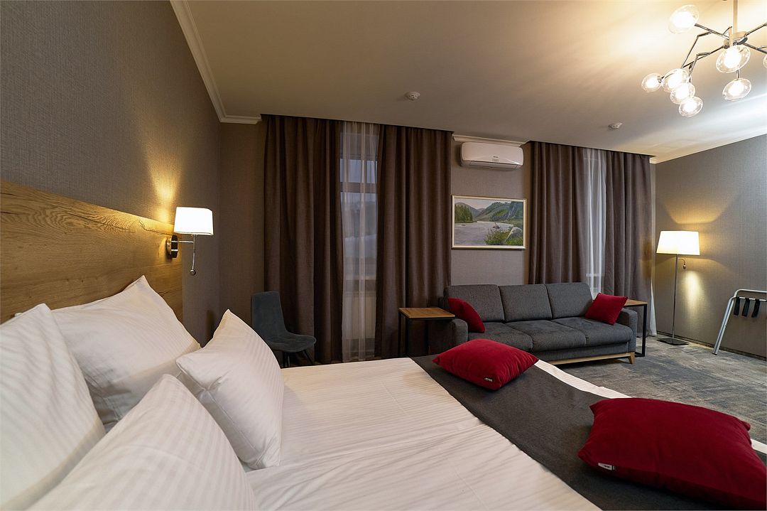 Изысканный классический интерьер, просторный однокомнатный номер с видом из окна на горы и реку. В номере двуспальная кровать и диван или две односпальные кровати и диван. При бронировании можно указать предпочтения. Данная категория не гарантирует наличия балкона в каждом номере.