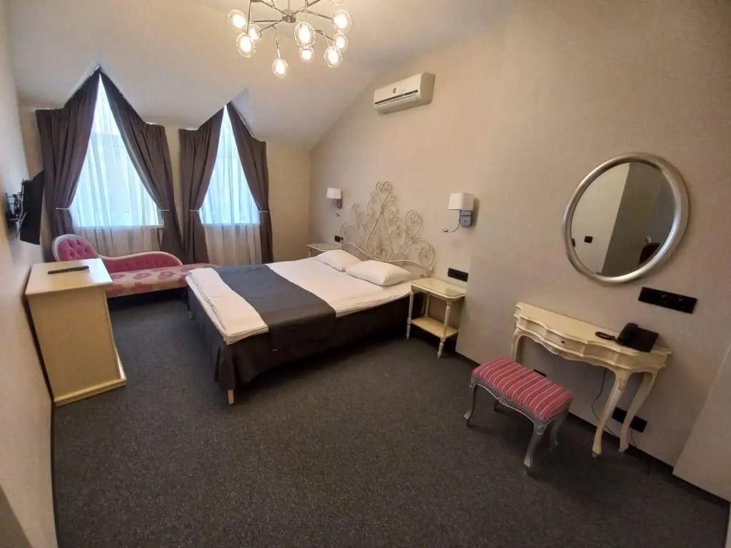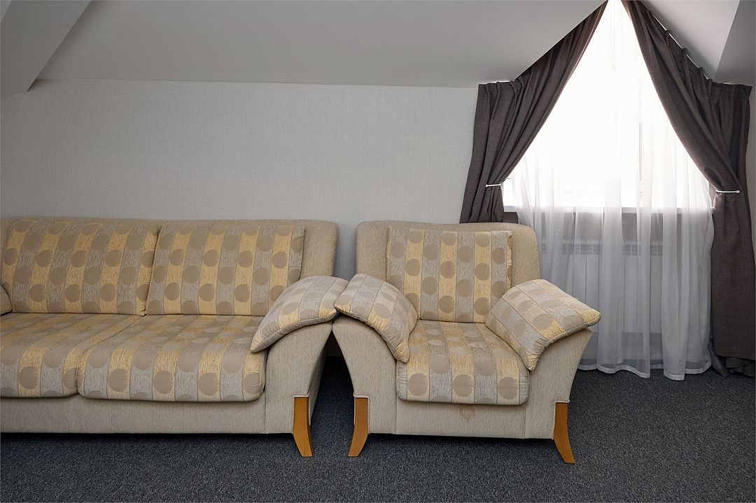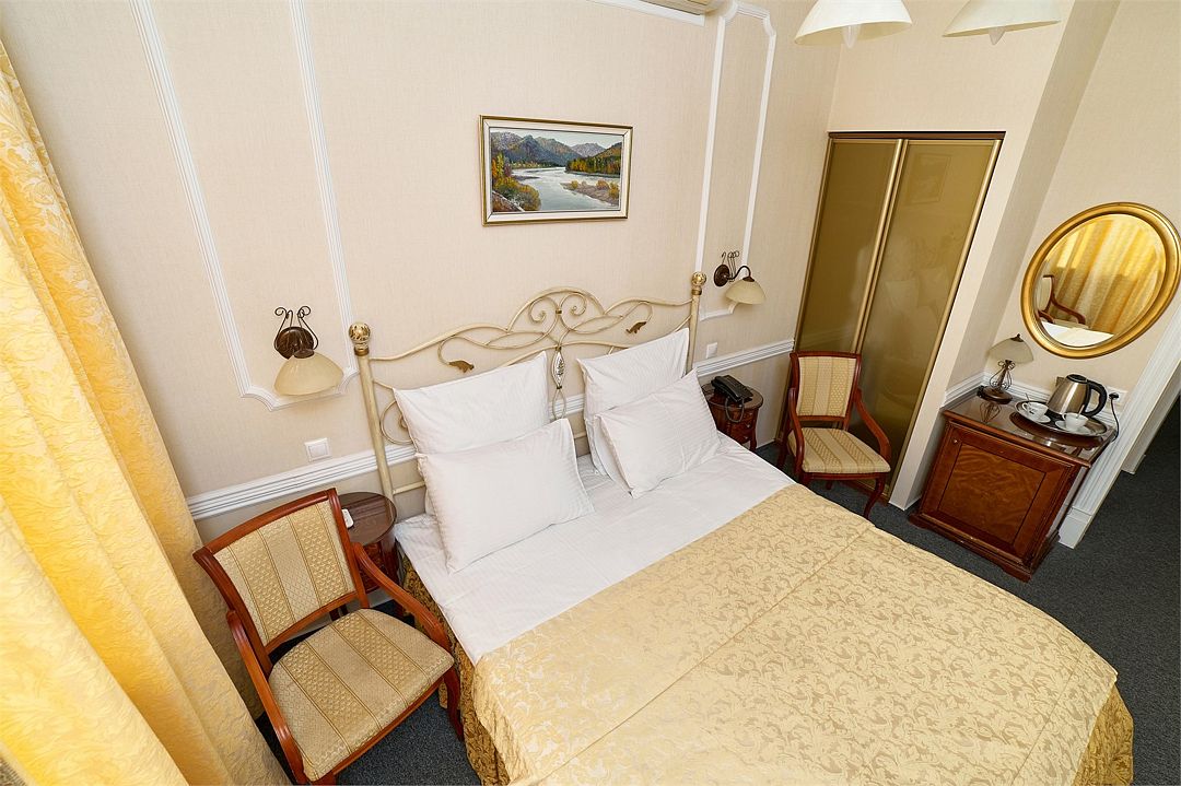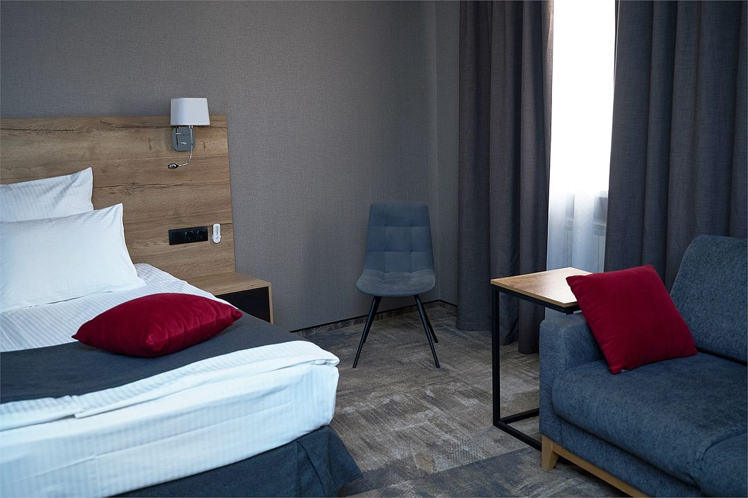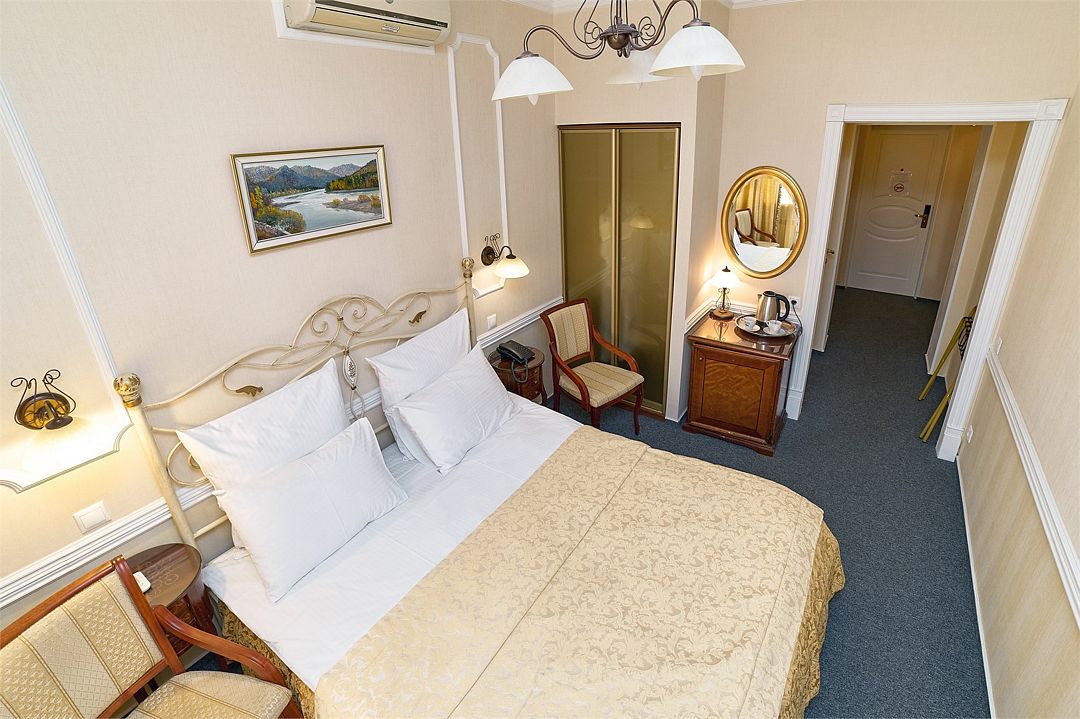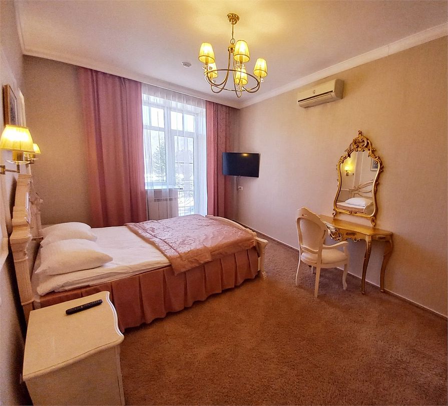 Изысканный классический интерьер, просторный однокомнатный номер с видом из окна на горы и реку. В номере двуспальная кровать и диван или две односпальные кровати и диван. При бронировании можно указать предпочтения. Данная категория не гарантирует наличия балкона в каждом номере.