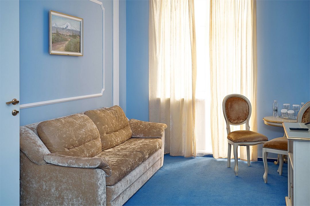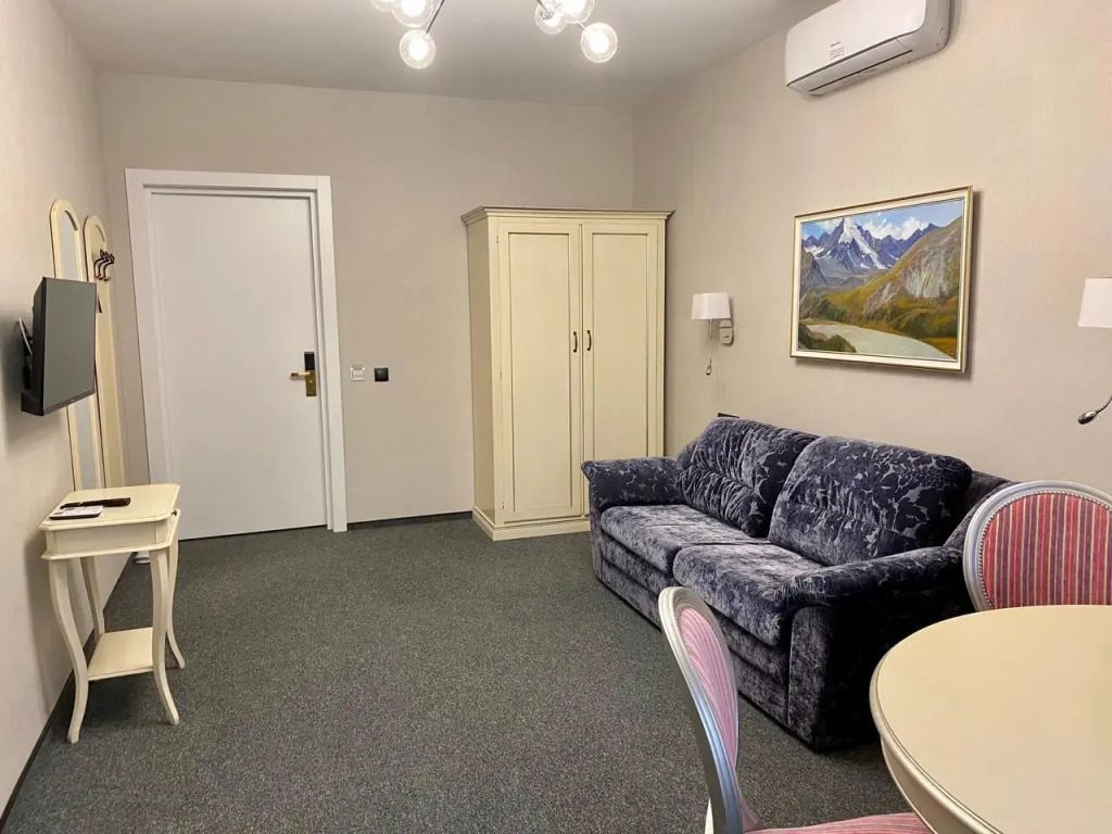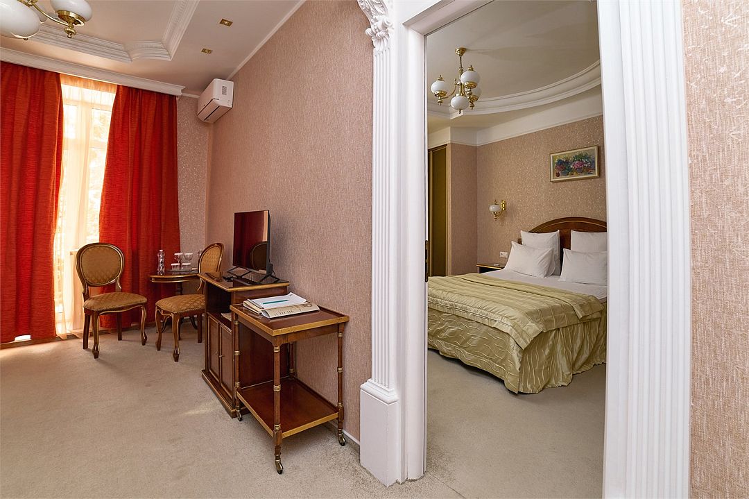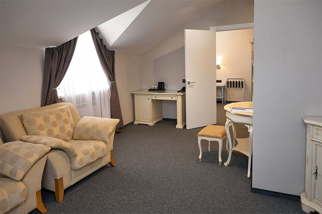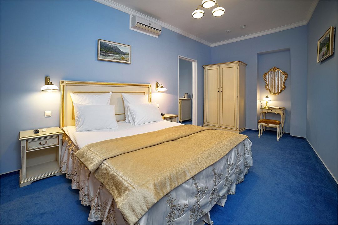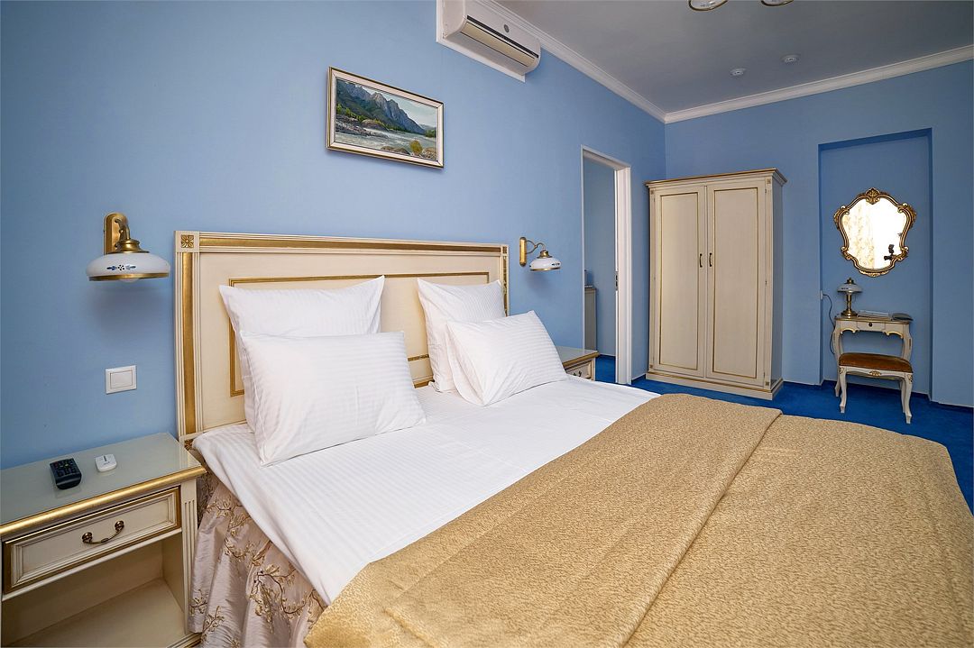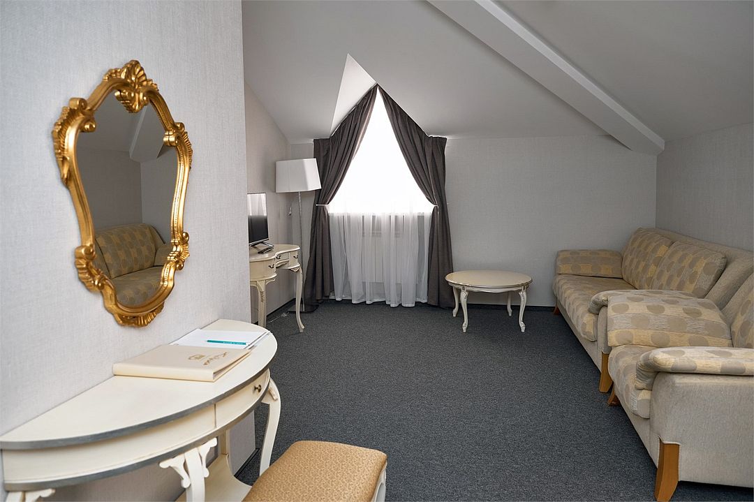 Изысканный классический интерьер, просторный двухкомнатный номер с гостиной, видом из окна на горы и реку. В номере двуспальная кровать и диван или две односпальные кровати и диван. При бронировании можно указать предпочтения. Данная категория не гарантирует наличия балкона в каждом номере.Услуги и удобства