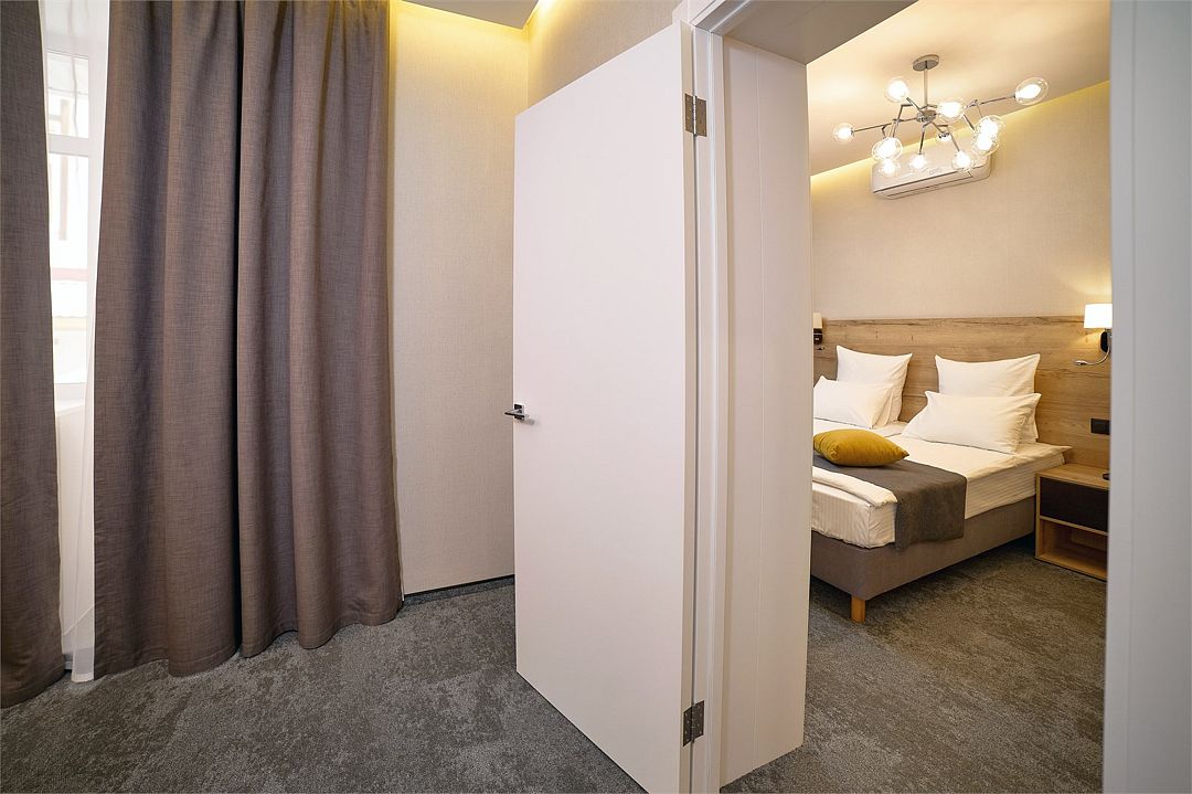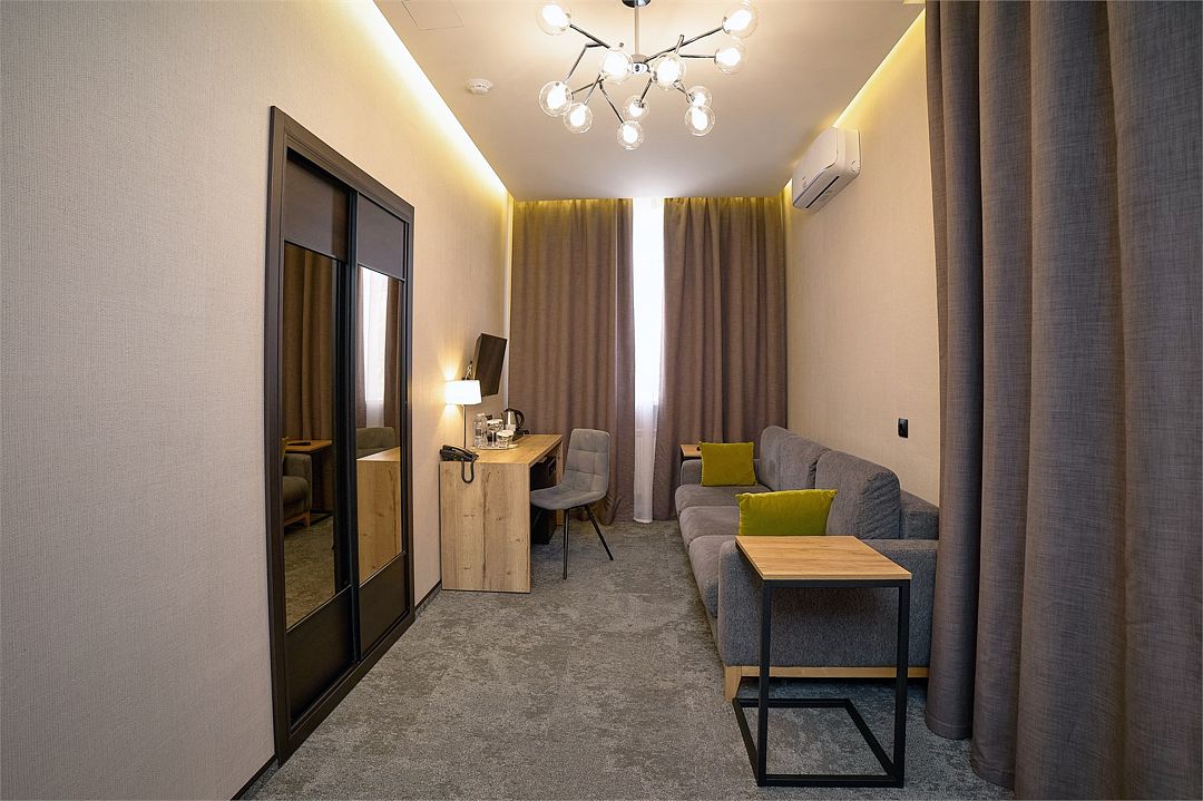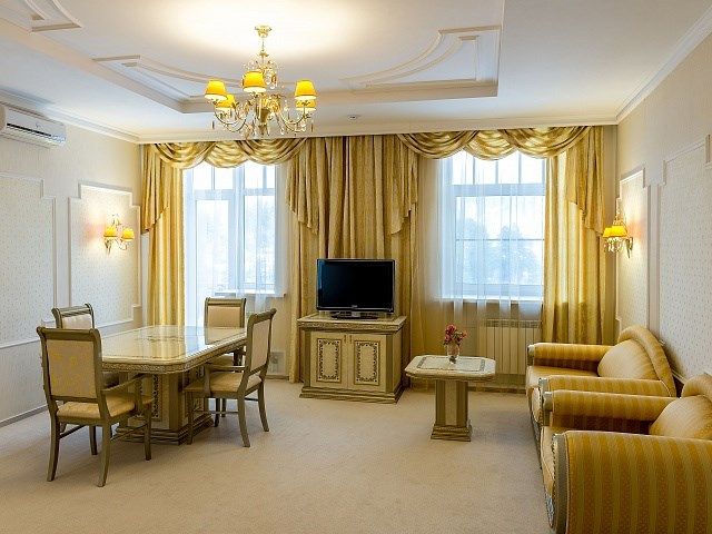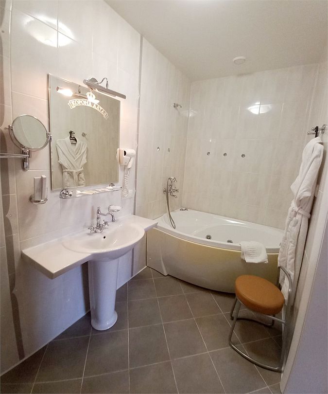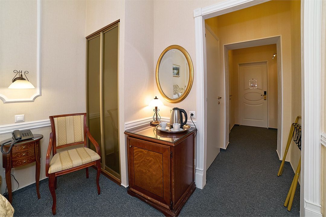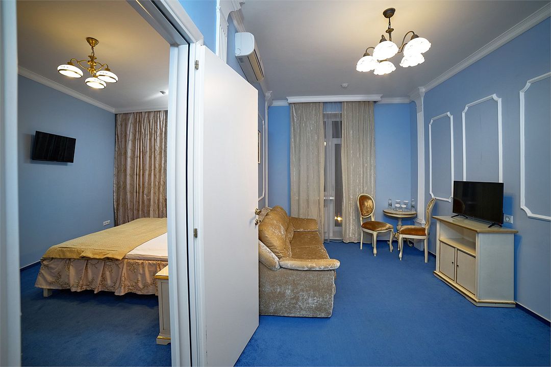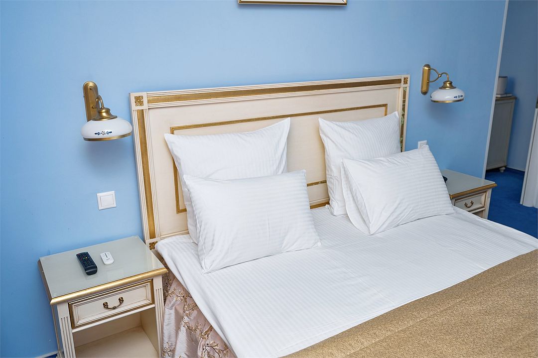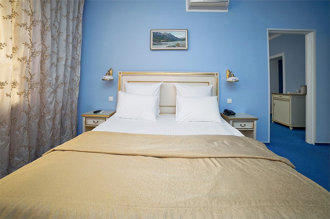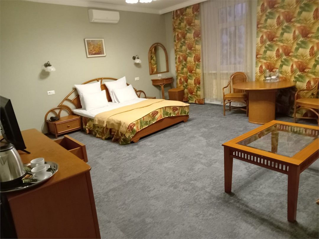 Изысканный классический интерьер, просторный двухкомнатный номер с гостиной, видом из окна на горы и реку. В номере двуспальная кровать и диван или две односпальные кровати и диван. При бронировании можно указать предпочтения. Данная категория не гарантирует наличия балкона в каждом номере.Услуги и удобства