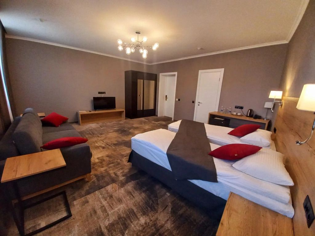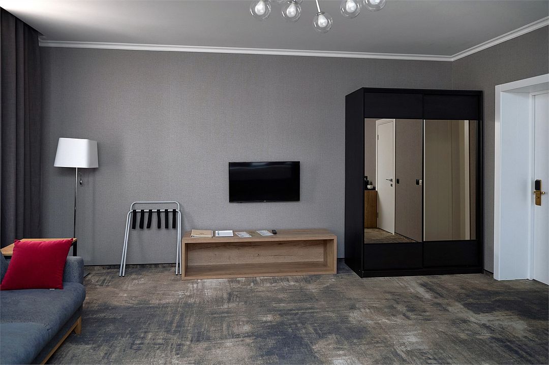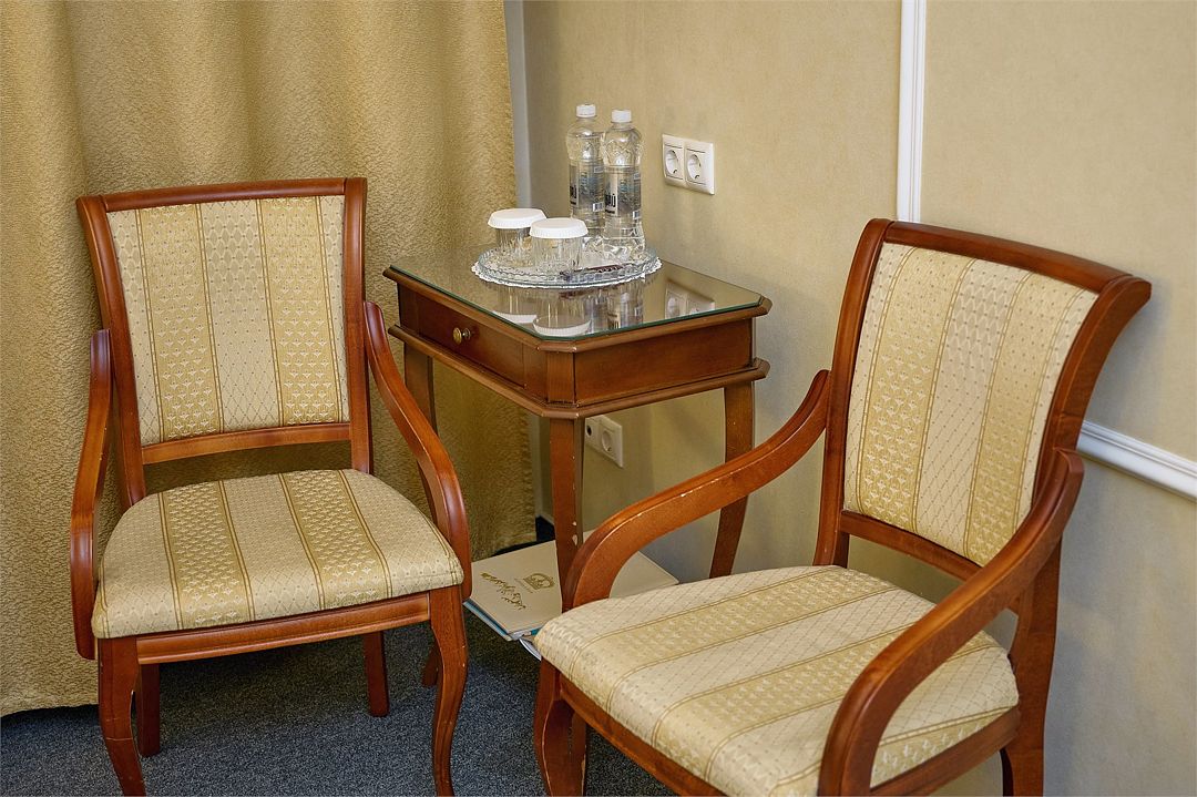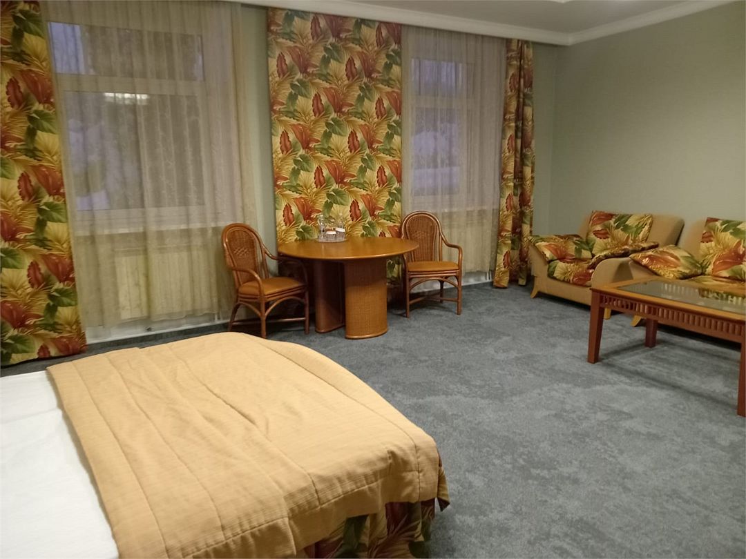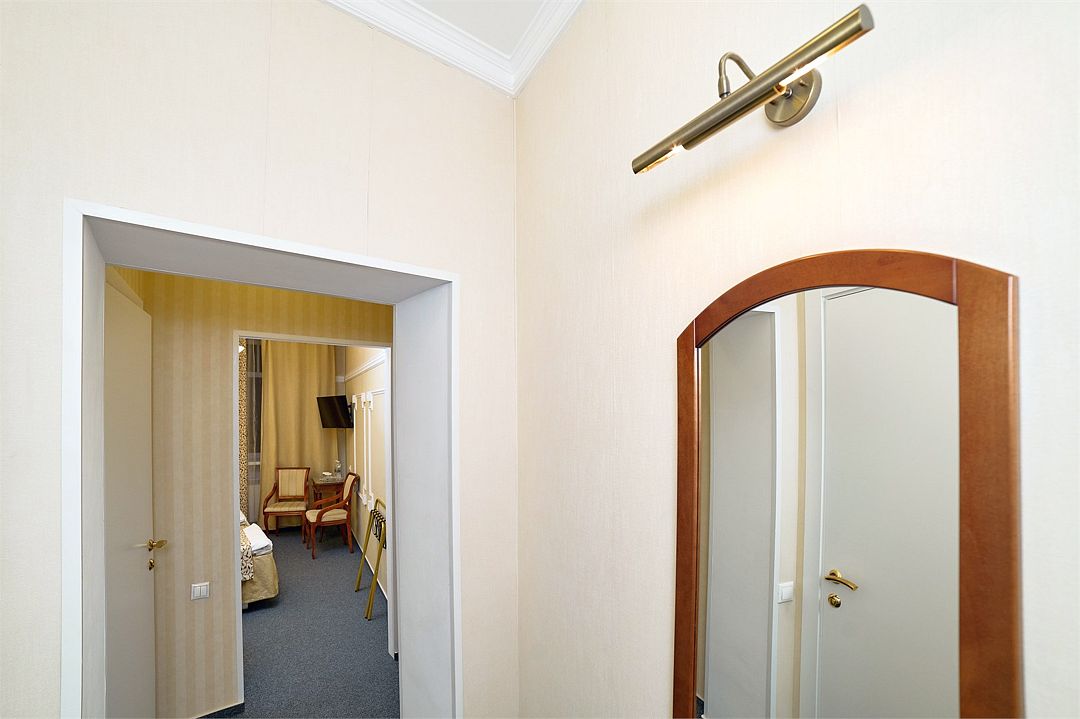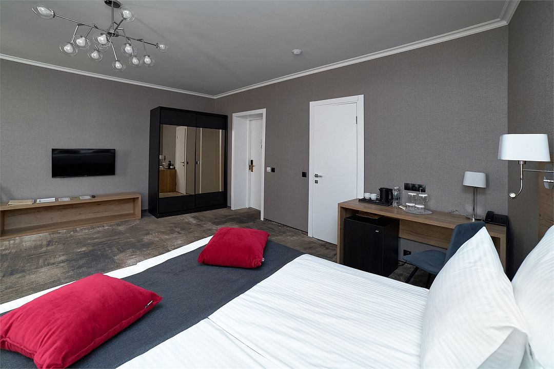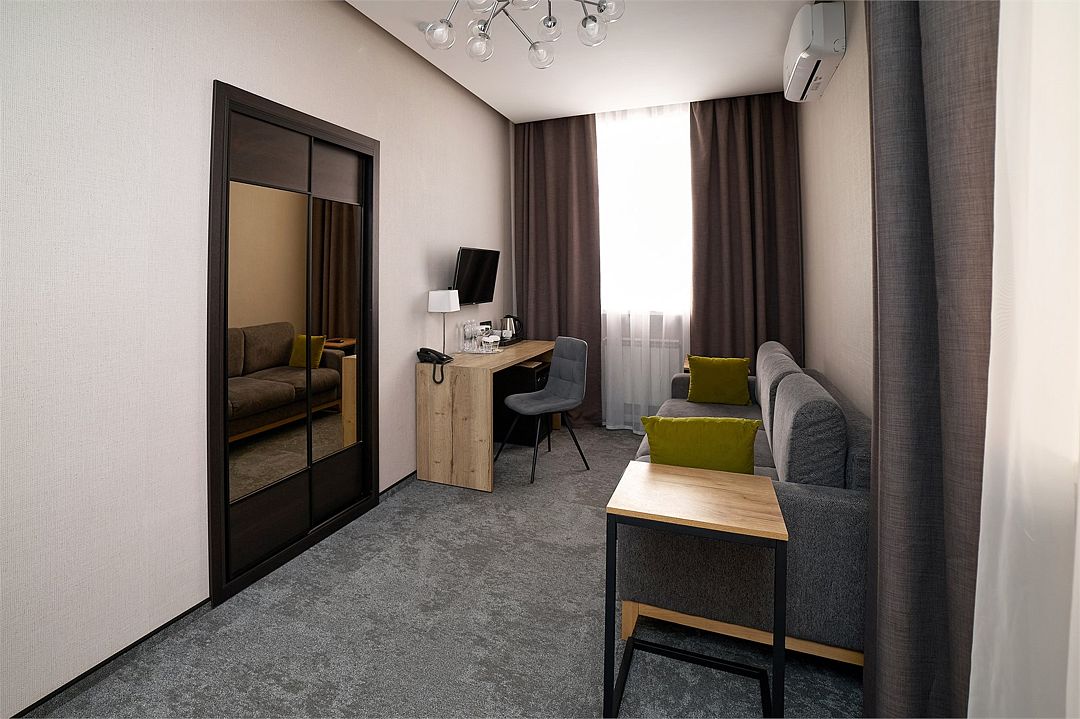 Изысканный классический интерьер, просторный двухкомнатный номер с гостиной, видом из окна на горы и реку. В номере двуспальная кровать и диван или две односпальные кровати и диван. При бронировании можно указать предпочтения. Данная категория не гарантирует наличия балкона в каждом номере.Услуги и удобства