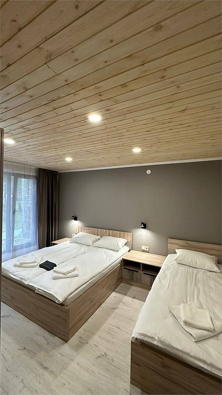 В номере: прихожая гостиная: вешалка, стол, обеденный стол, стулья, диван, телевизор; кухонная зона: холодильник, микроволновая печь, эл. чайник, набор посуды две спальные комнаты: прикроватные тумбочки, шкаф (в одной из спален два шкафа) большая терраса (стол, стулья) (номера могут отличаться друг от друга своей комплектацией) Санузел: туалет, умывальник, душ, фен, пол с подогревом Вид корпусов: отдельно стоящий деревянный дом с панорамными окнами, с террасой с видом на реку и собственной мангальной зонойУслуги и удобства