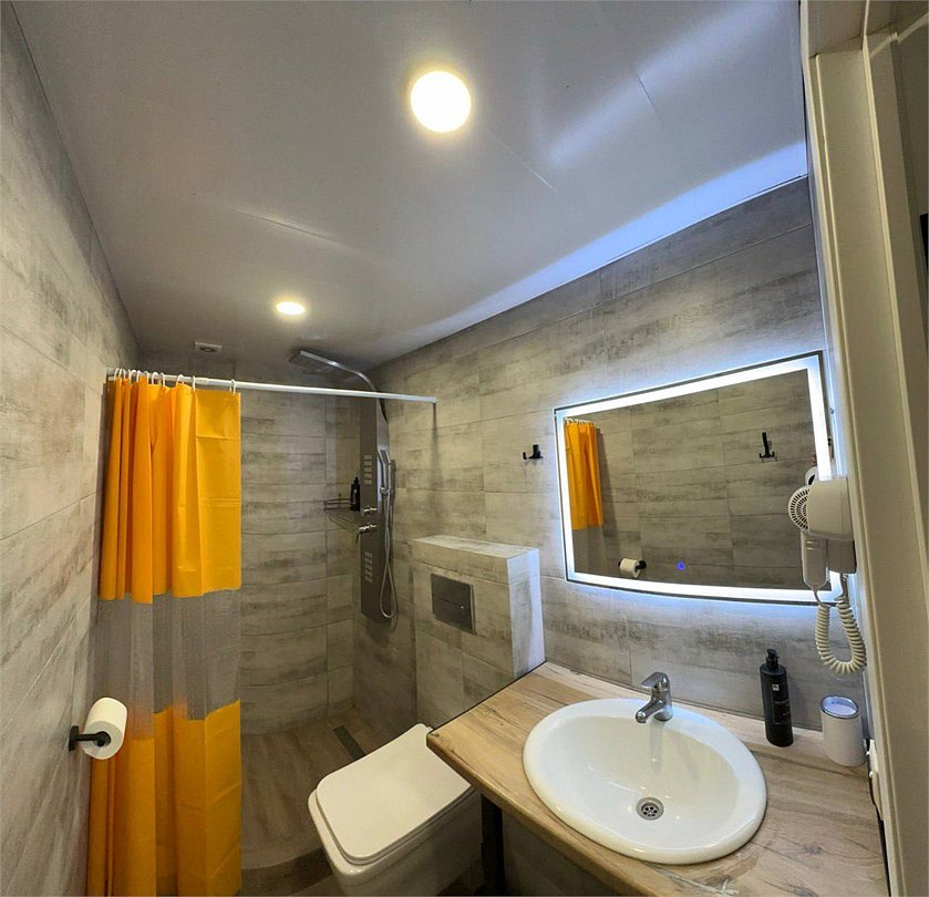 телевизор, санузел, двуспальная кровать, стулья, шкаф для одежды, журнальный столик, обеденный стол, зеркало, раковина, душ, туалетные средства, туалет, раскладной диван, двуспальный раскладной диван-кроватьВ гостиничном номере