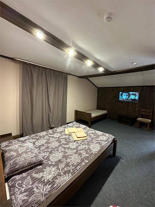 Большая терраса, собственная мангальная зона В гостиной: шкаф для одежды, набор мягкой мебели, журнальный столик, телевизор, кухонная зона (мини-кухня с мойкой и электроплитой, чайник, холодильник, печь СВЧ, набор посуды), столовая зона (стол, мягкие стулья) В спальной комнате: прикроватные тумбочки, стол, телевизор Санузел: туалет, умывальник, душ Вид корпусов: благоустроенный каменный/деревянный коттедж на 2-4 номераУслуги и удобства