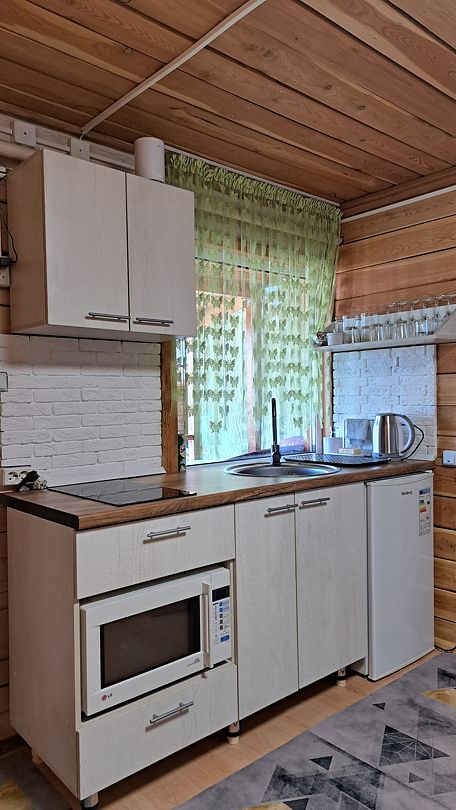 Кухня на 6 номеров одна и 2 больших беседки, находятся на открытом воздухе со всем необходимым для приготовления пищи (плита газовая, микроволновка, посуда, мангальная зона, ракета с казаном, раковина с проточной водой). В беседках холодильники (6 номеров, 6 столов, 6 холодильников).