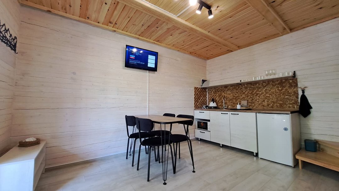 Кухня со всей необходимой посудой. Электроплита, чайник, микроволновка, холодильник, Смарт-ТВ, мангальная зона (шампура и решетки), полотенца кухонные, для рук и лица.