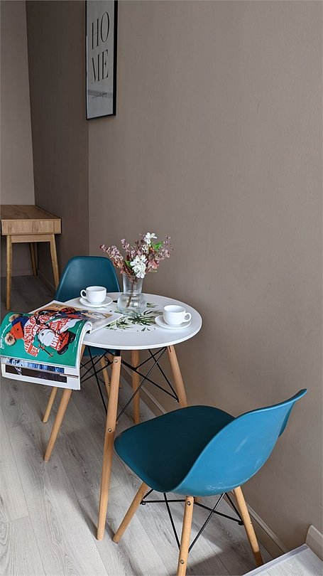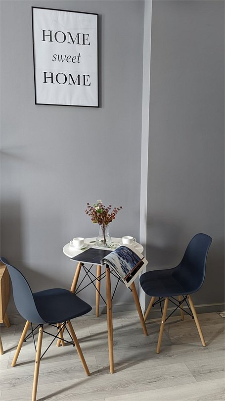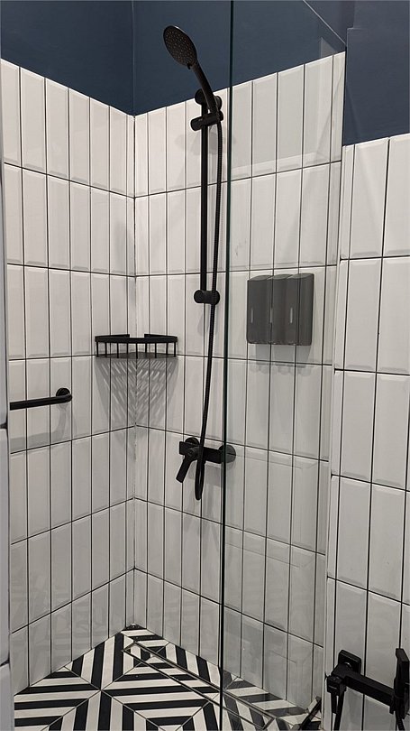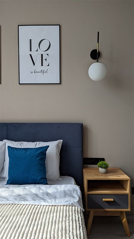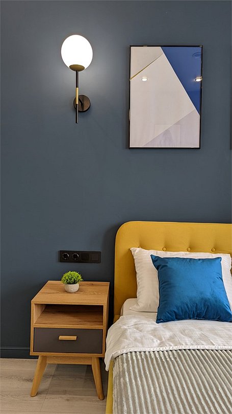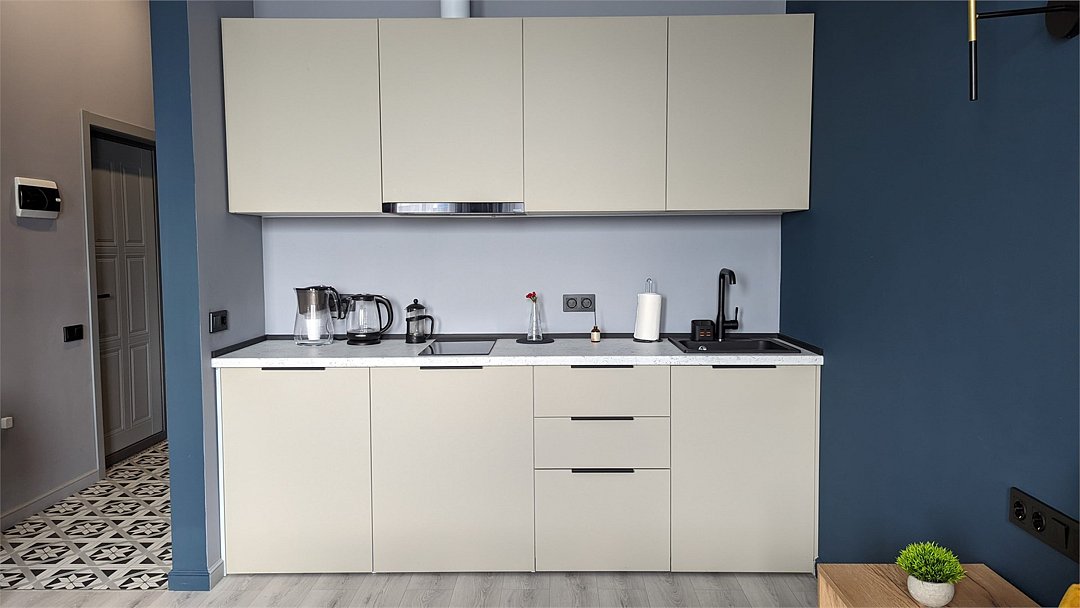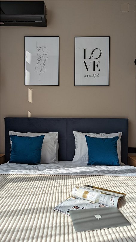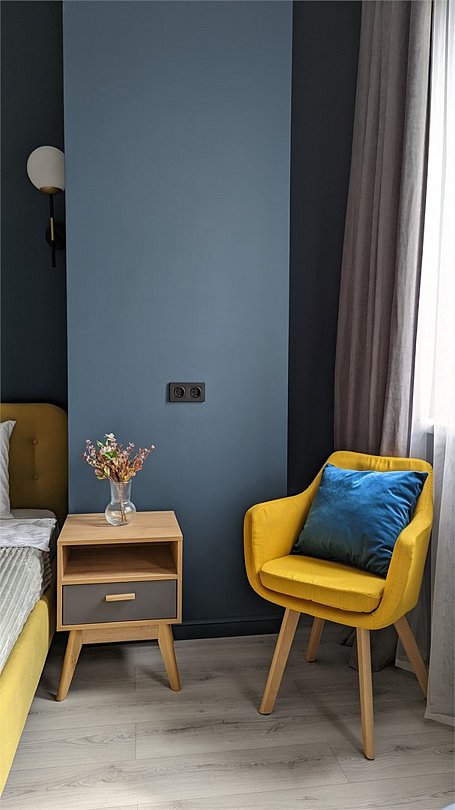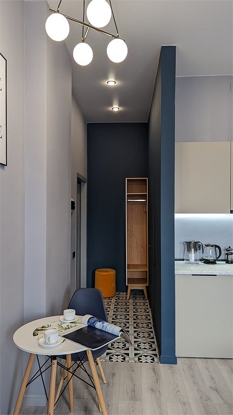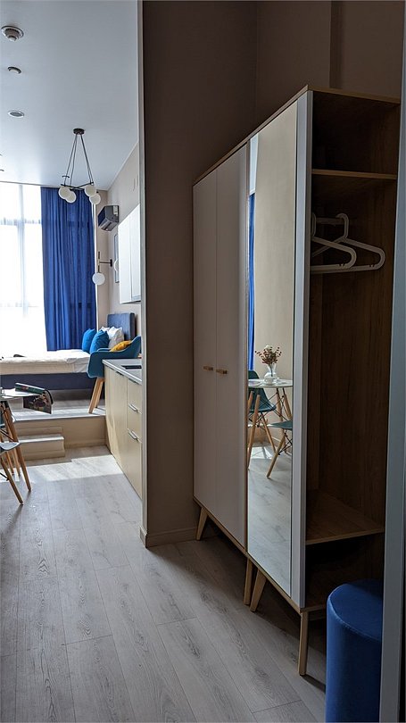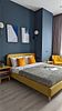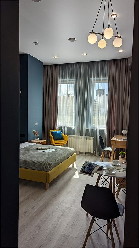 Номер-студия с двуспальной кроватью и индивидуальной ванной комнатой в номере. Дизайн студии выполнен в сапфирово-синих тонах.Услуги и удобства
