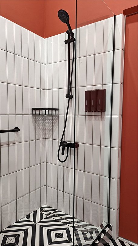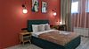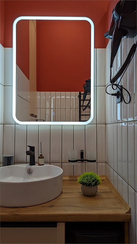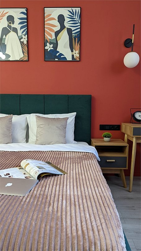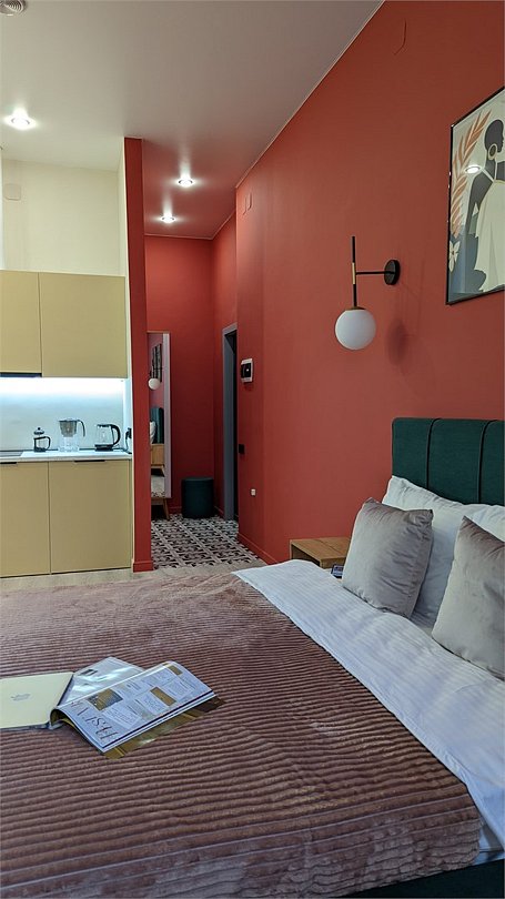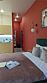 Номер-студия с двуспальной кроватью, выполненный в рубиново-красных тонах. Индивидуальная ванная комната в номереУслуги и удобства