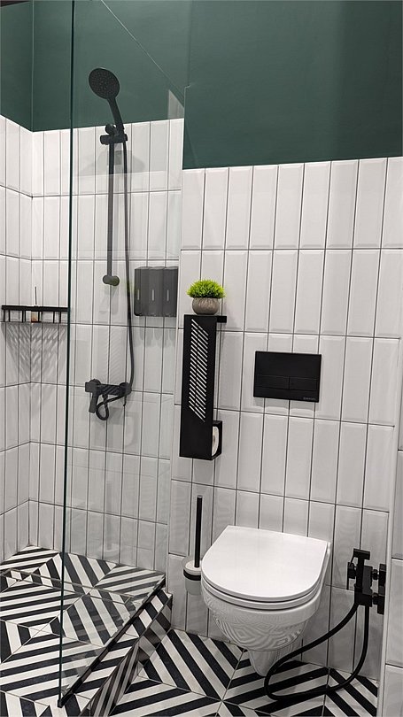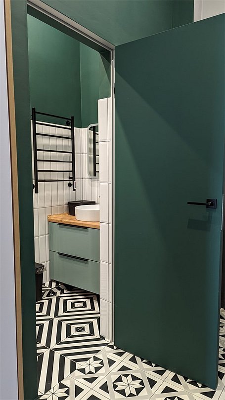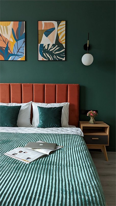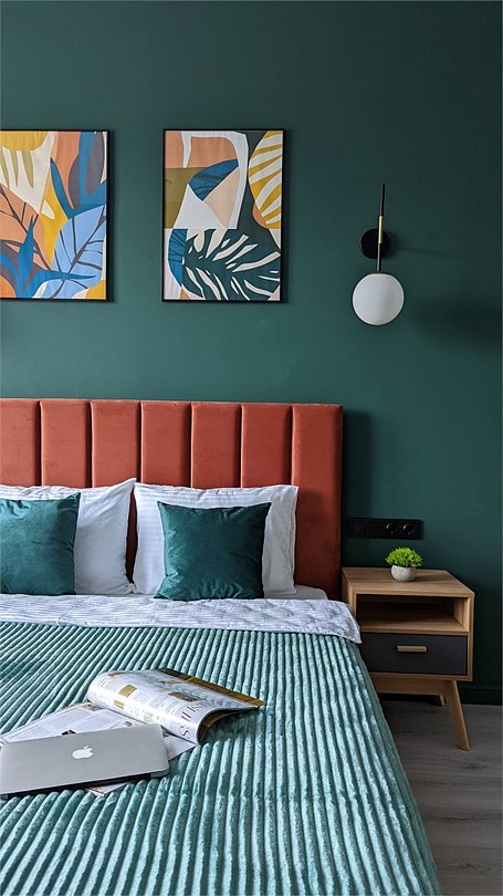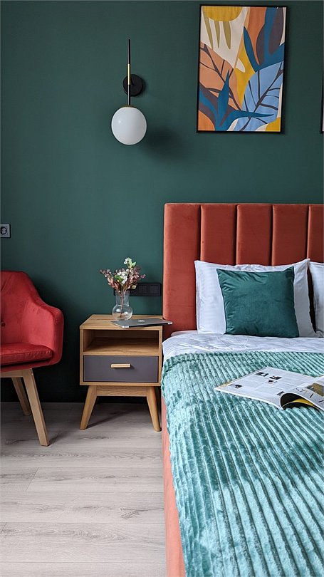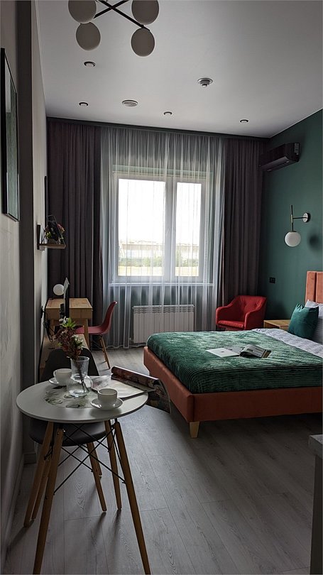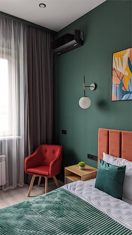 Номер-студия с двуспальной кроватью, индивидуальной ванной комнатой в номере. Интерьер выполнен в темно-зеленых тонах.Услуги и удобства