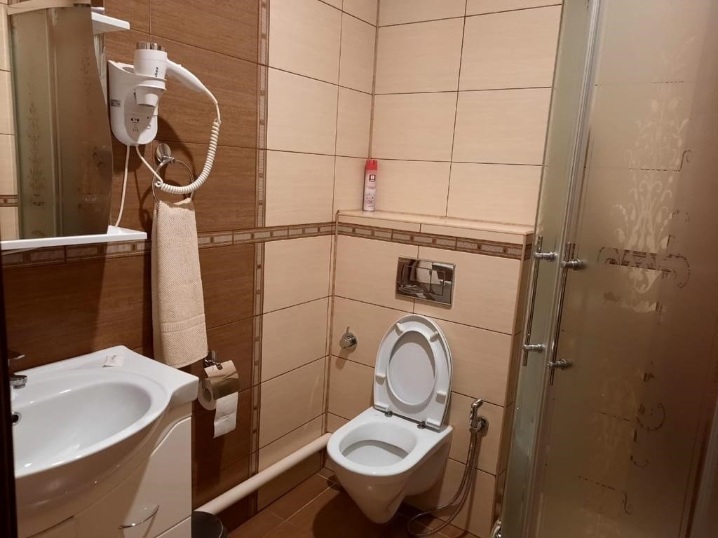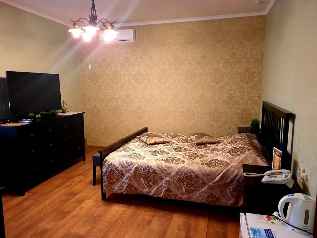Wi-Fi, кондиционер, фен, душевая кабина, санузел, халаты, банные полотенца, тапочки, косметические средства, двуспальная кровать, стулья, вешалки, обеденный стол, зеркало, комод, звуконепроницаемые стены и окна, чайный набор, обслуживание номеров, информационная карта, меню, чайник, унитаз, раковина, питьевая вода, отопление, душ, вид на город, паркет, стаканы, стул, туалет, цифровое тв, внутренний телефон, телевизор с плоским экраном, мини-холодильник, москитная сетка, шкаф-купе, номер для некурящих, гигиенический душВ гостиничном номере