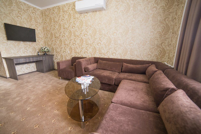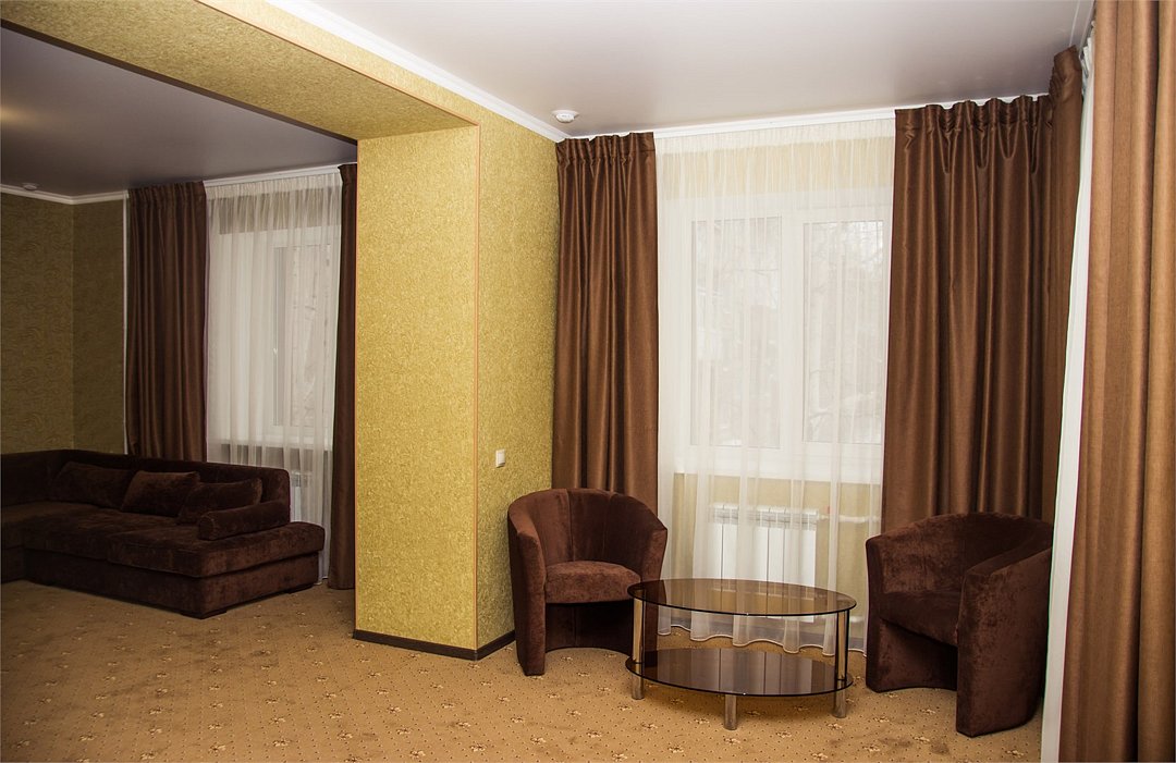 Двухкомнатный номер с отдельной спальней (с двуспальной кроватью, креслами и журнальным столиком) и гостиной, оборудованной диванной зоной и телевизором. Интернет и цифровое телевидение, кондиционер, холодильник. Уютную атмосферу создает богатое текстильное оформление и декоративные решения отделки. Душевая кабина и необходимый набором банных принадлежностей.Услуги и удобства