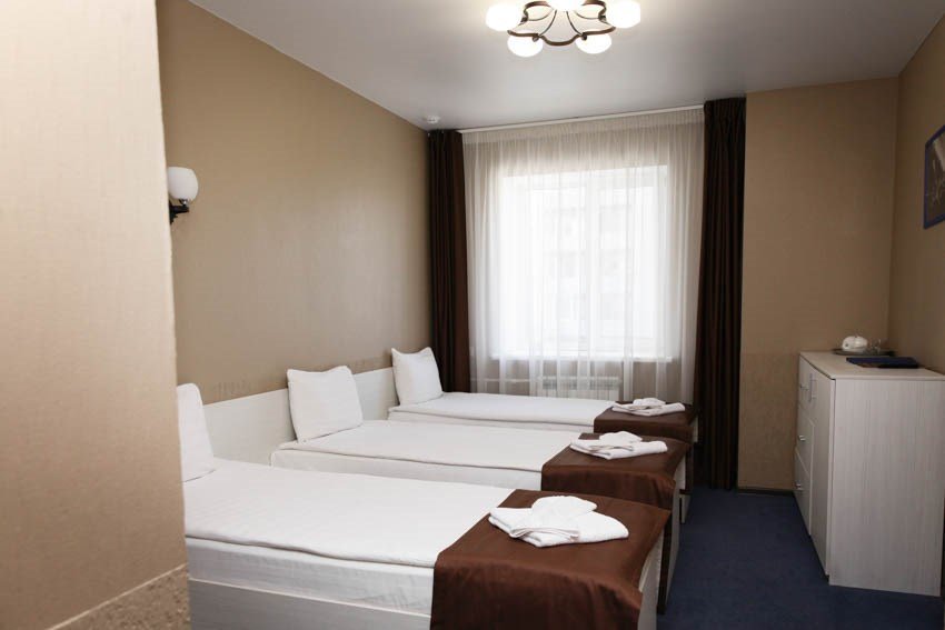 телевизор, Wi-Fi, кондиционер, светильник, ванная комната, душевая кабина, банные полотенца, тапочки, гигиенические средства, тумбы, стулья, шкаф для одежды, вешалки, зеркало, чайный набор, унитаз, раковина, ковровое покрытие, душ, кулер на этаже, три односпальные кровати, вид во двор, стаканы, туалетные средства, внутренний телефонВ номере