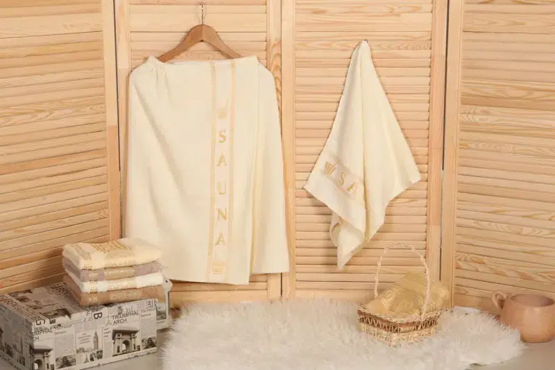 Комплект банных принадлежностей для максимально комфортного отдыха в банном комплексе (шапочка, халат, полотенце, тапочки).