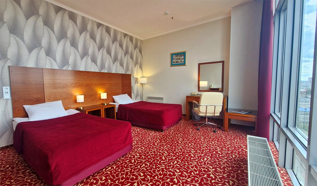 спутниковое телевидение, Wi-Fi, телефон, кондиционер, светильник, настольные лампы, фен, ванна, санузел, банные принадлежности, банные полотенца, гигиенические средства, две полутораспальные кровати, стулья, вешалки, письменный стол, зеркало, комод, мини-бар, чайный набор, обслуживание номеров, информационная карта, меню, сейф, унитаз, раковина, ковровое покрытие, вид на город, кулер на этаже, без питомцевВ гостиничном номере