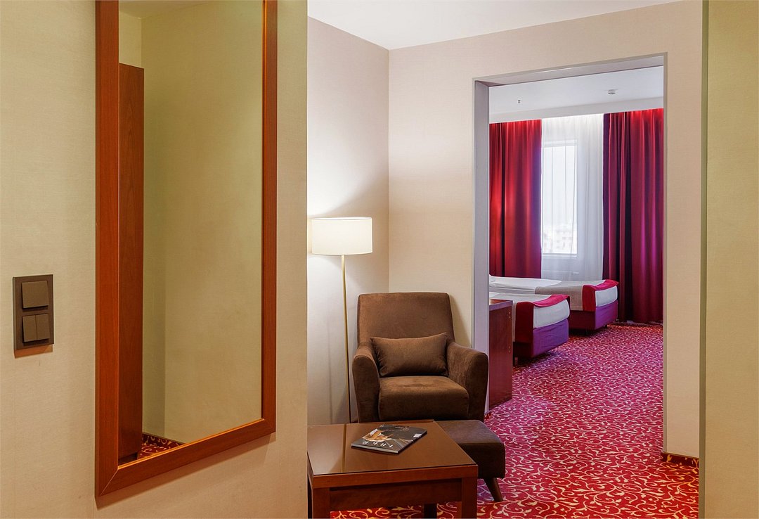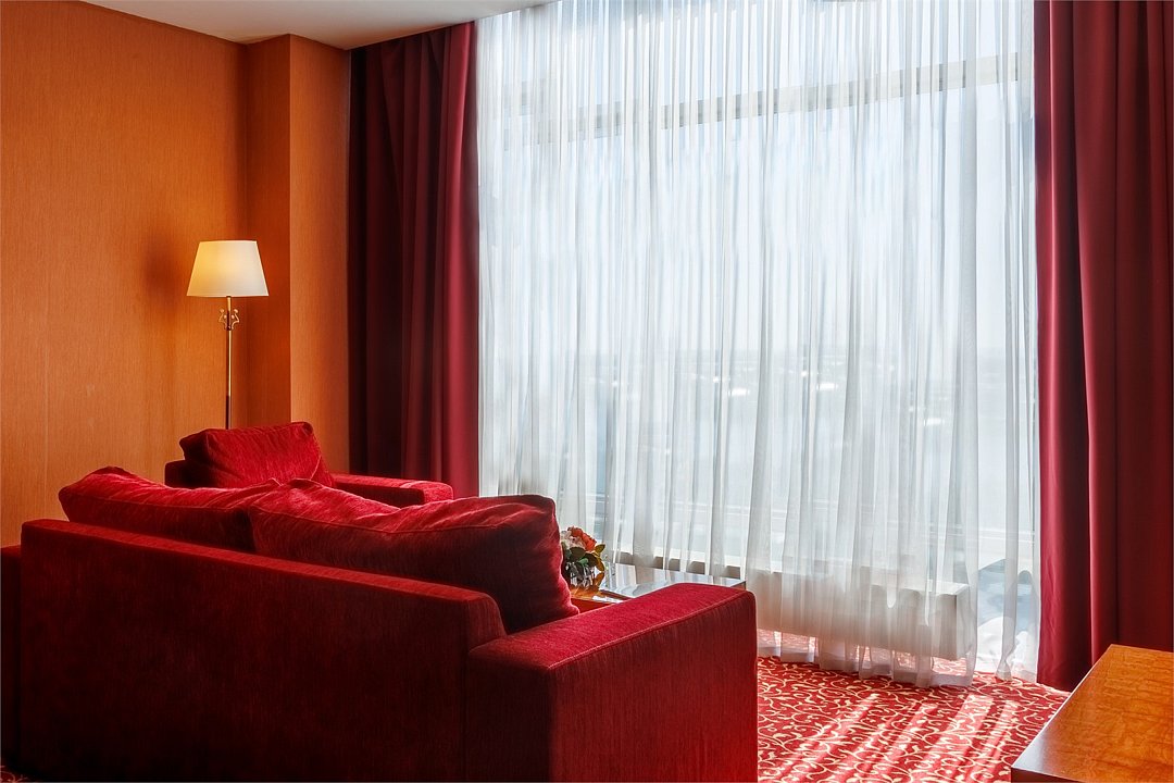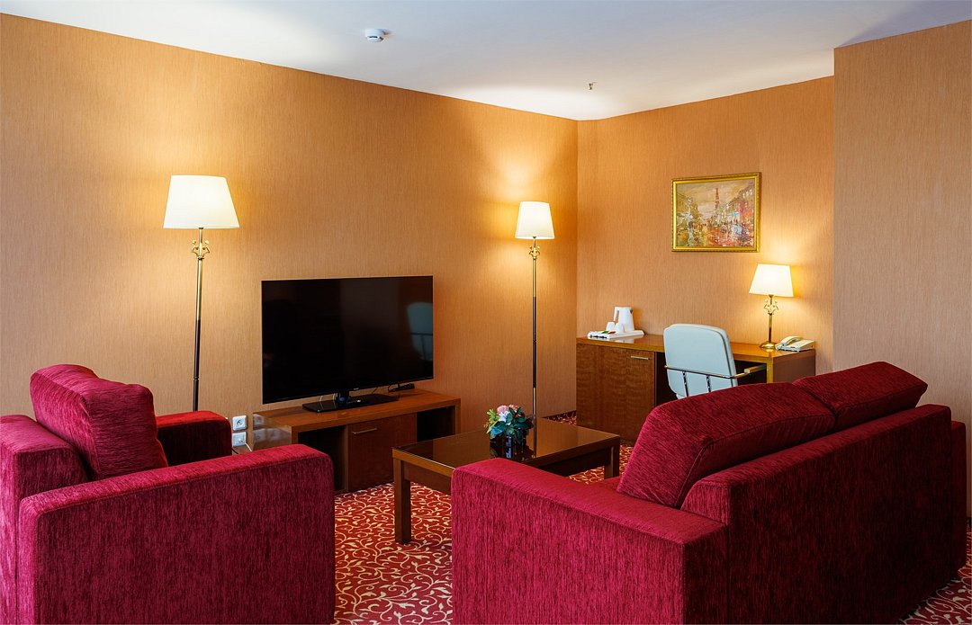 спутниковое телевидение, Wi-Fi, телефон, кондиционер, светильник, настольные лампы, фен, ванная комната, ванная с джакузи, санузел, банные принадлежности, халаты, банные полотенца, тапочки, гигиенические средства, кровать «King size», диван, кресла, стулья, шкаф для одежды, вешалки, журнальный столик, письменный стол, зеркало, две комнаты, мини-бар, чайный набор, обслуживание номеров, информационная карта, меню, сейф, унитаз, раковина, мягкая мебель, ковровое покрытие, вид на город, кулер на этаже, без питомцевВ гостиничном номере