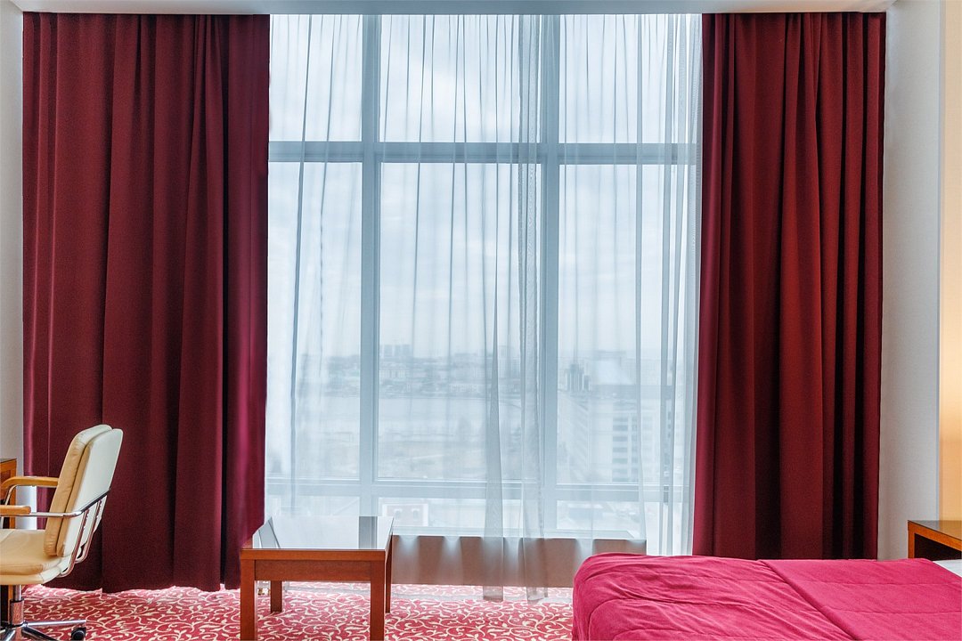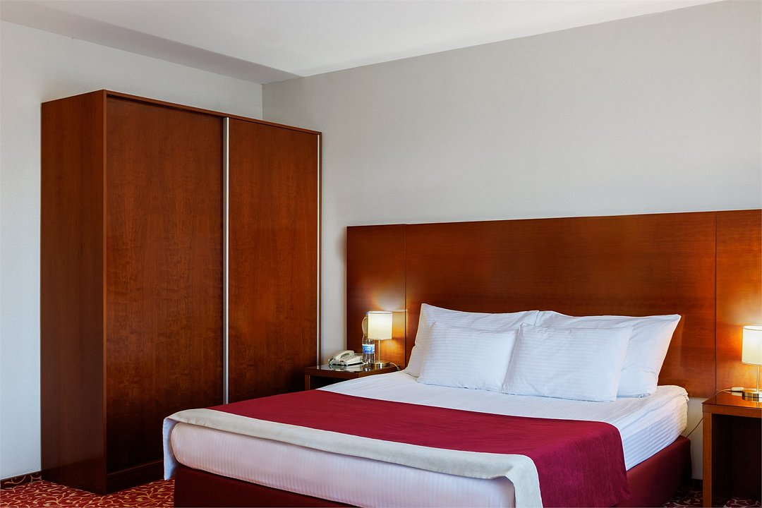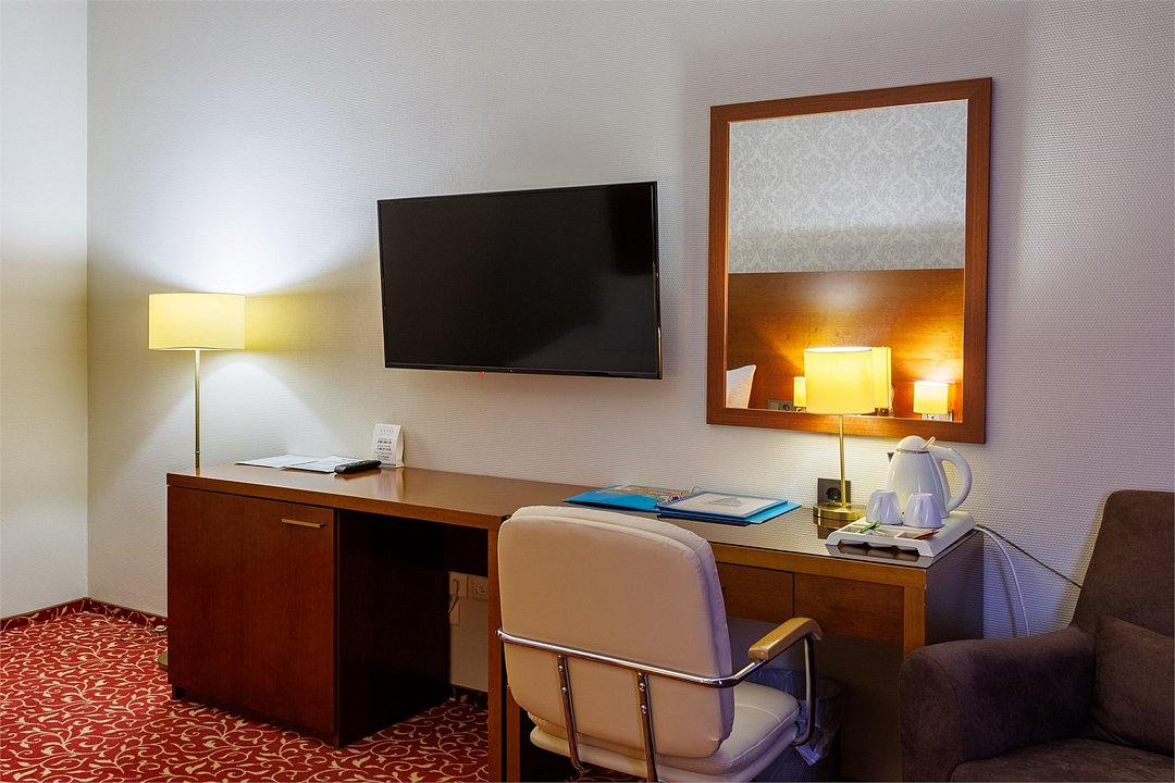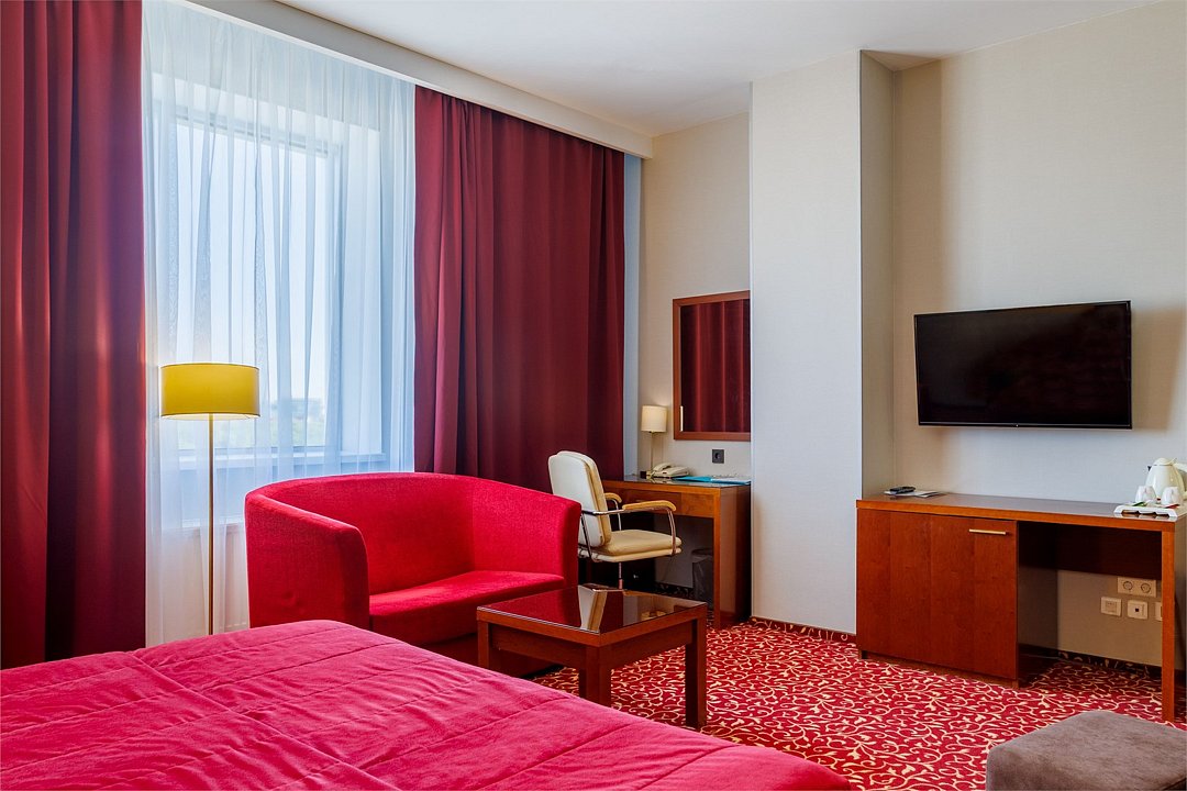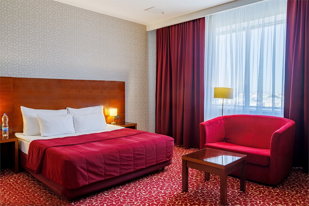 спутниковое телевидение, Wi-Fi, телефон, кондиционер, светильник, настольные лампы, фен, ванна, санузел, банные принадлежности, банные полотенца, гигиенические средства, кровать «King size», стулья, шкаф для одежды, вешалки, письменный стол, зеркало, комод, мини-бар, чайный набор, обслуживание номеров, информационная карта, меню, сейф, унитаз, раковина, ковровое покрытие, вид на город, кулер на этаже, без питомцевВ гостиничном номере