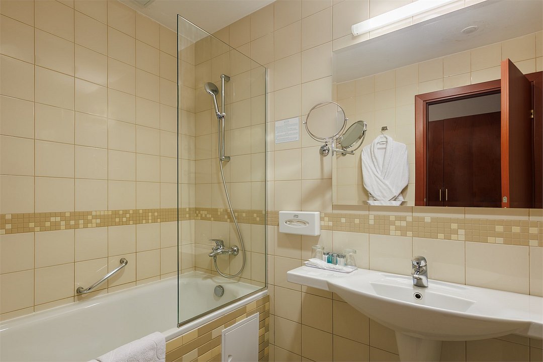 Матрасы на кроватях удобные, подушки тоже, постельное белье белоснежное. В шкафу лежит дополнительные одеяло и подушка. Имеется сейф, правда очень маленький, холодильник, телевизор, халаты, тапочки, полотенца. При заезде была вода в бутылках, далее на каждом этаже стоит кулер, мы наливали из него в освободившиеся бутылки. В ванной комнате шампунь, гель для душа и кондиционер в бытылочках. Фен не удобный. Еще небольшой минус за то, что в самой ванне небольшое ограждение и вода из душа часто попадает на пол, приходилось стелить полотенце на пол. Напор воды хороший.