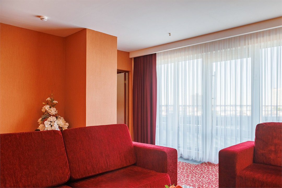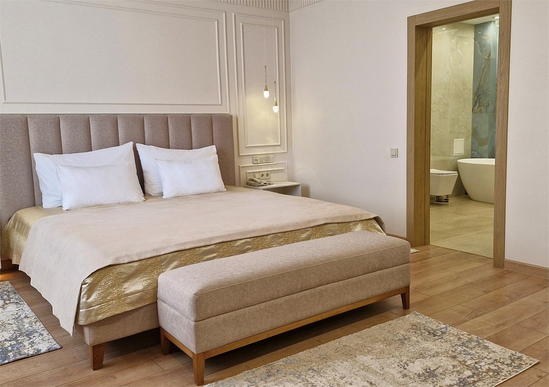 В отеле 2 номера категории Люкс. Оба номера имеют спальню, гостиную с удобным диваном и креслами, просторный холл и два санузла. Из окон этого номера открывается прекрасный вид на город.Услуги и удобства