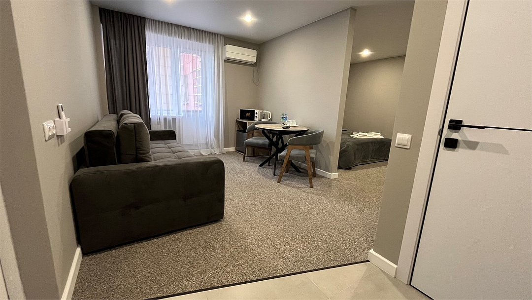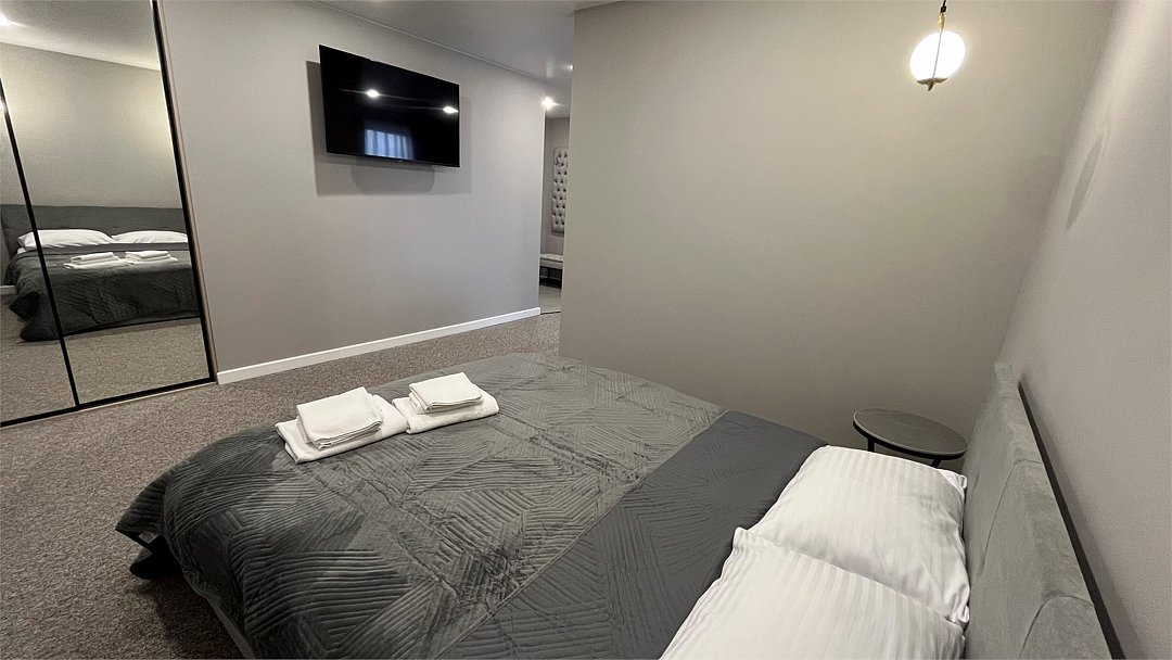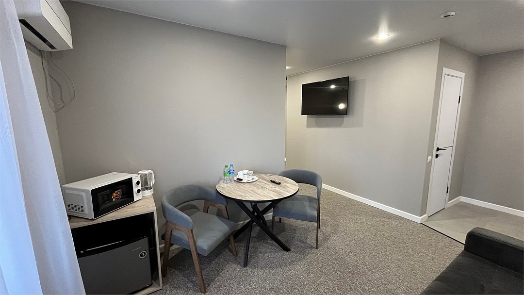2 комнаты: гостиная и спальня. В гостиной: мягкая мебель, письменный стол, журнальный стол, шкаф для одежды, холодильник, телевизор, кондиционер, эл.чайник, набор посуды В спальне: двуспальная кровать, прикроватные тумбы, напольная вешалка. Душ и санузел в номере, фен, средства личной гигиены.Услуги и удобства