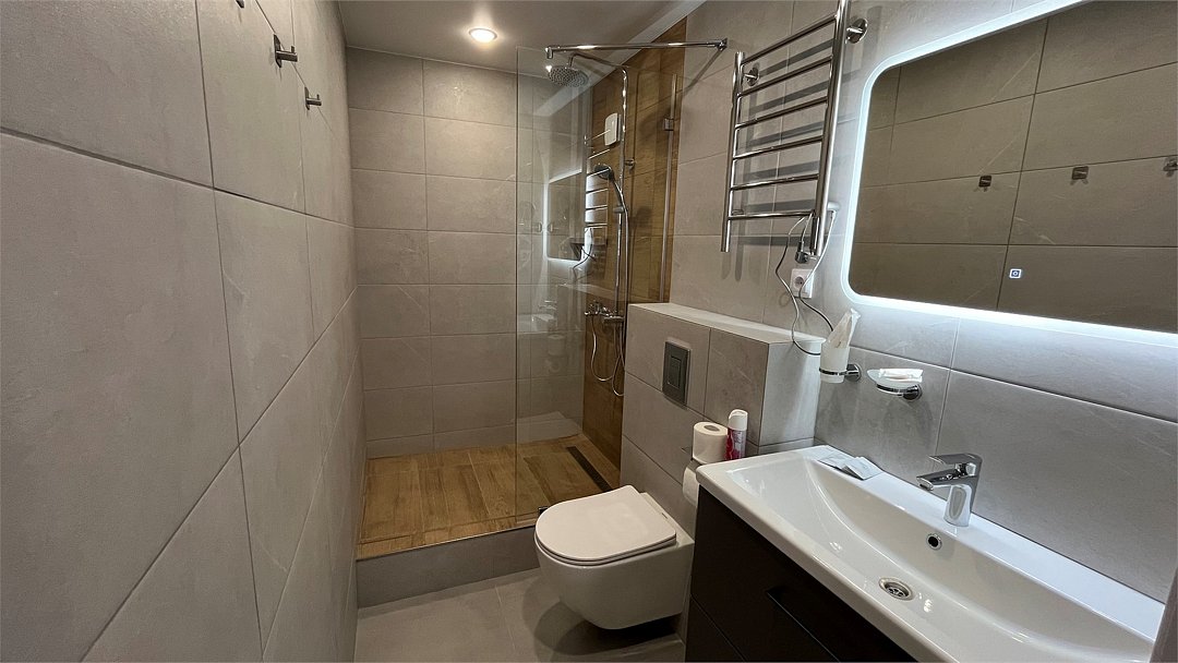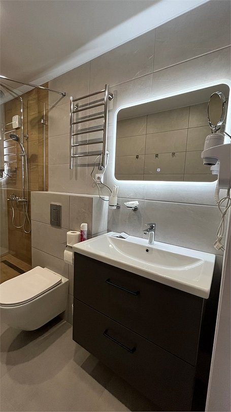 Интерьер номера выполнен в современном цветовом стиле.Номер с балконом, есть комфортная двуспальная кровать, диван-кровать, обеденная зона с раскладывающимся столом, мягкие современные кресло-стулья, СВЧ, мини-холодильник, большой ТВ с WI-FI. В ванной комнате есть фен, электрический полотенцесушитель. В данном номере можно проживать с семьей из 4 чел.Услуги и удобства