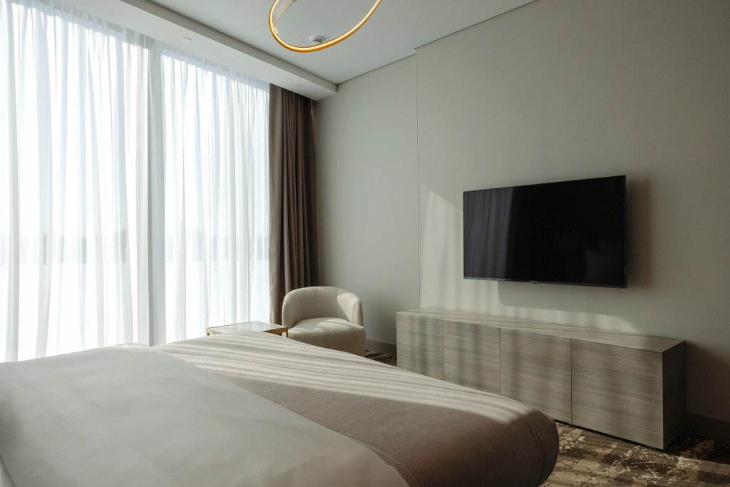 Номер уютно обставлен и оснащён необходимым, чтобы отдохнуть после долгого и насыщенного дня. Имеются телевизор. Оснащение зависит от выбранной категории номера.