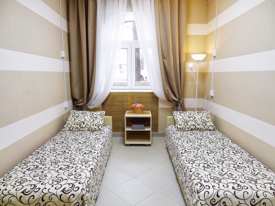 В двухместном номере расположены 2 односпальные кровати, которые можно соединить в 1 двуспальную. В номере имеются: -1 тумба -1 пуфик -1 шкаф с вешалками -1 светильник -1 урна для общего пользования. Номер просторный светлый.Услуги и удобства