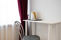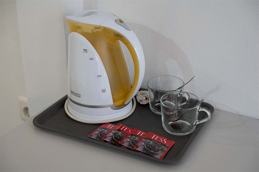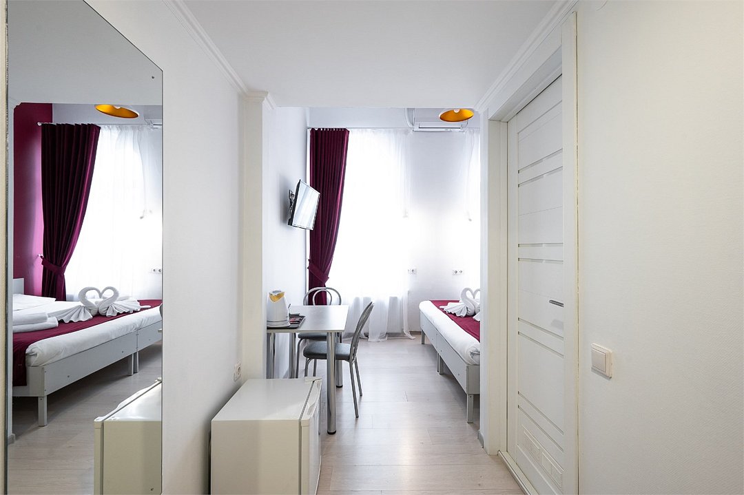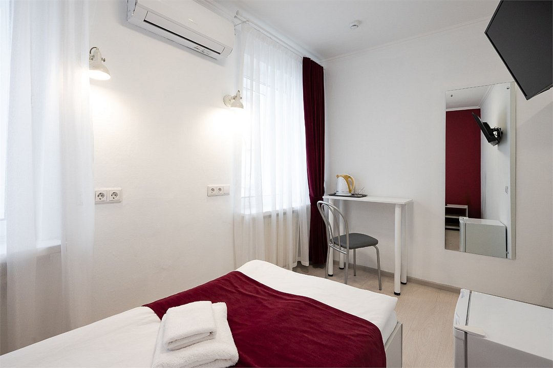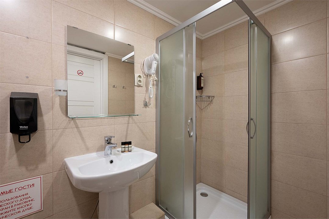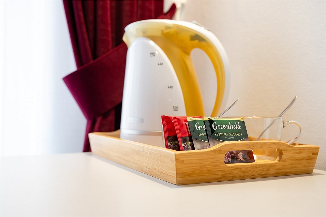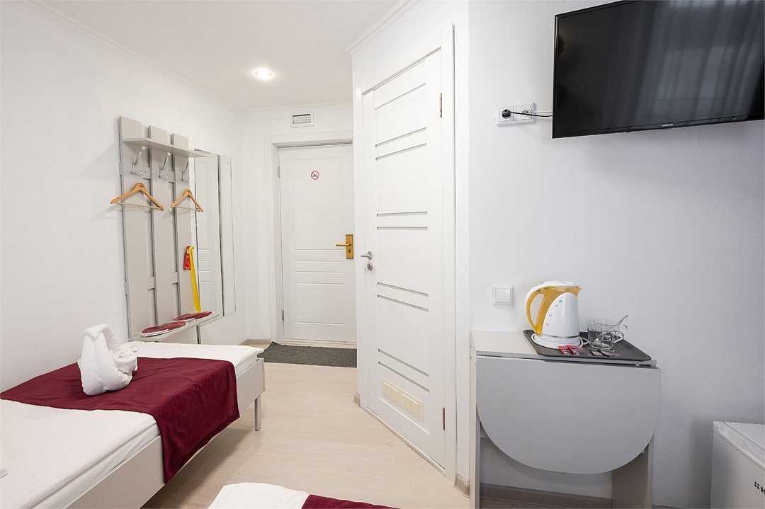 телевизор, Wi-Fi, кондиционер, фен, электронные замки, микроволновая печь, утюг, душевая кабина, тапочки, две односпальные или большая двуспальная кровать, вешалки, обеденный стол, чайник, кулер на этаже, стол, туалетные средства, мини-холодильник, гигиенический душ, уборка номера, мылоВ номере