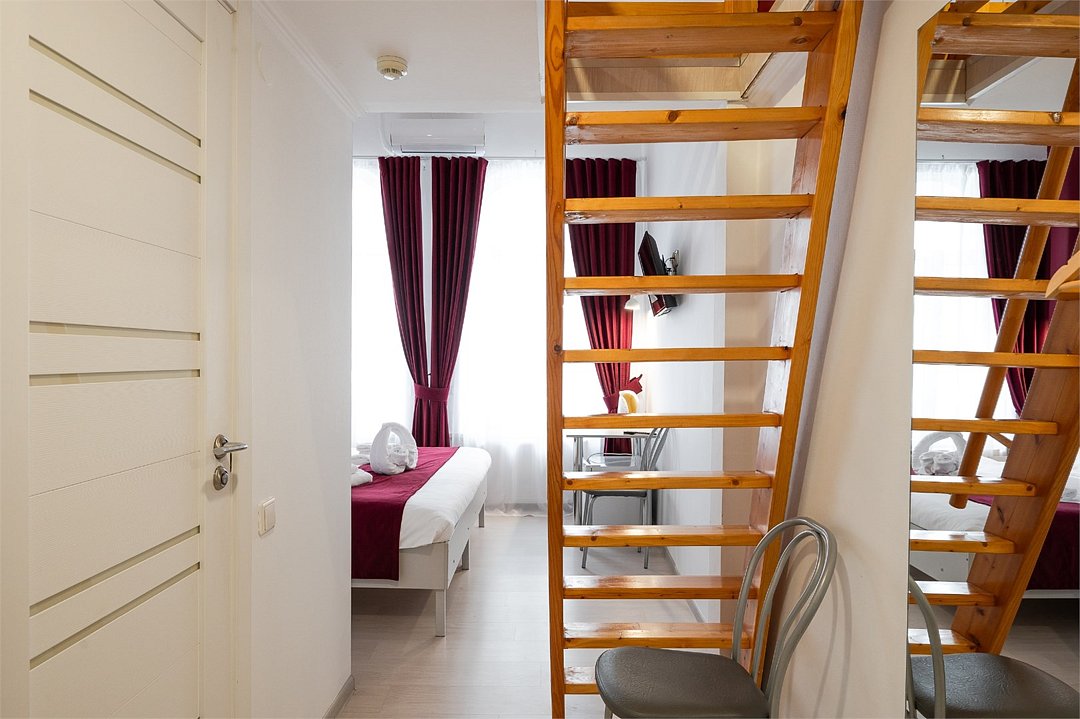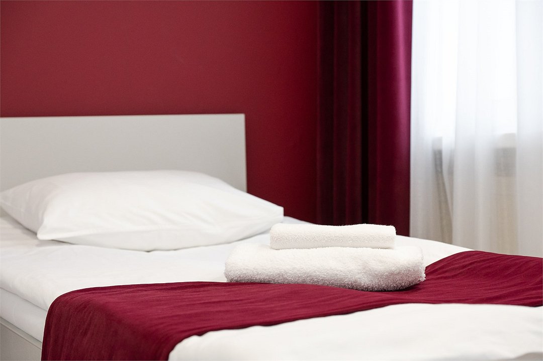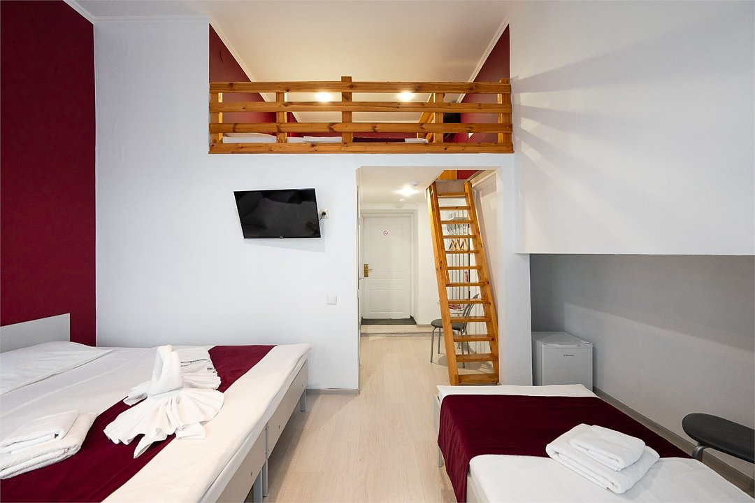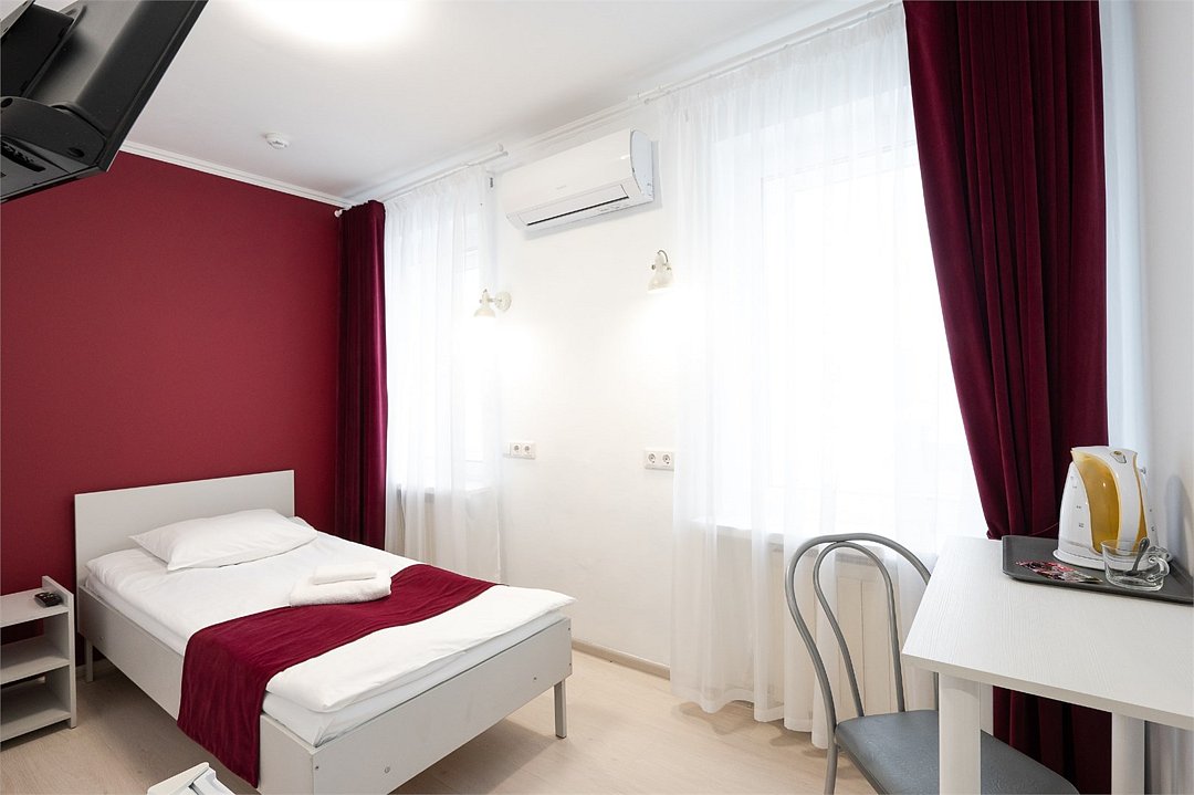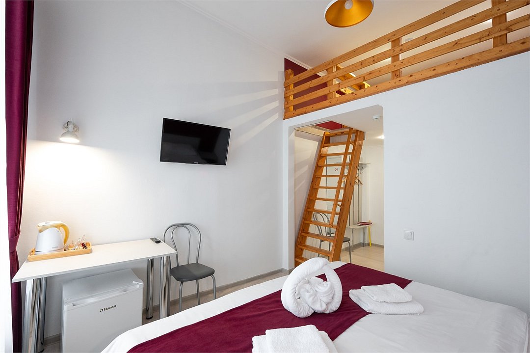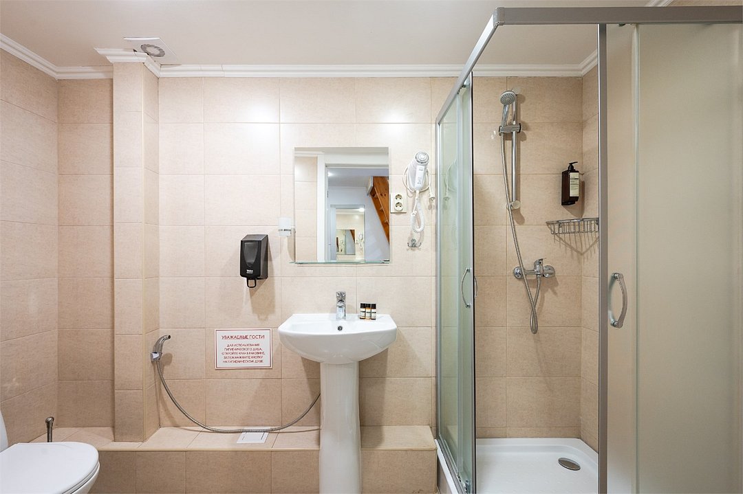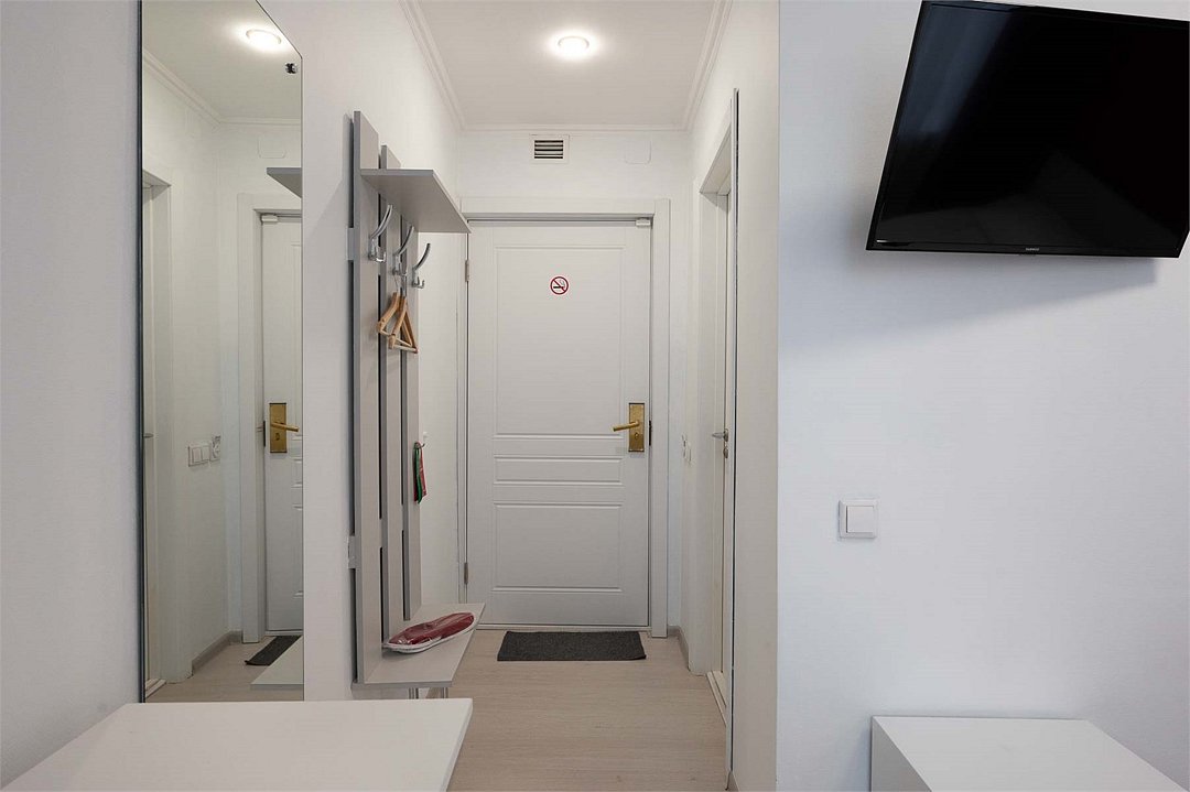 телевизор, Wi-Fi, кондиционер, фен, электронные замки, микроволновая печь, утюг, душевая кабина, тапочки, две односпальные или большая двуспальная кровать, вешалки, обеденный стол, чайник, кулер на этаже, стол, туалетные средства, мини-холодильник, гигиенический душ, уборка номера, мылоВ номере