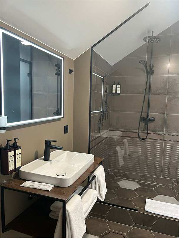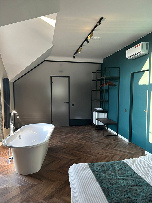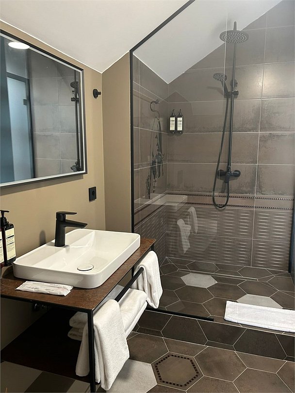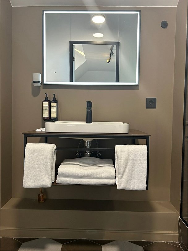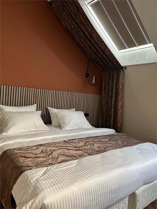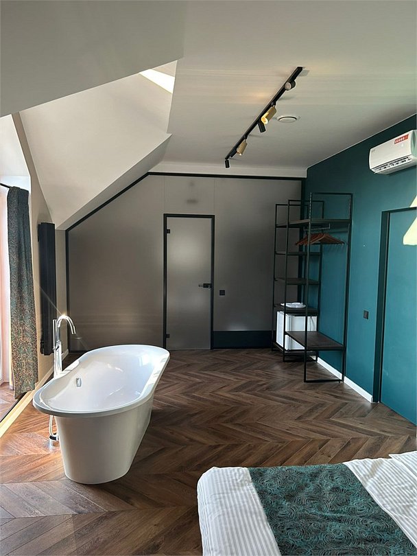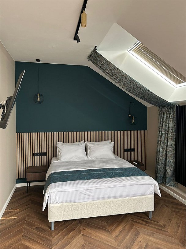 Уютный номер категории люкс с панорамным окном и окном мансарда с жалюзи блек аут ,что позволяет хорошо выспаться после прогулок по городу или рабочего дня. Ванная комната оснащена дорогой сантехникой Керама мараци , зеркало с подсветкой , качественные гарнитуры для душа , дизайнерская плитка и качественный ремонт. Также для вашего удобства мы предоставляем фен мощностью 1200кв, и премиальную косметику серии румах (табак- ваниль) шампунь и гель для душа ,мыло для рук и лосьон для тела .Услуги и удобства