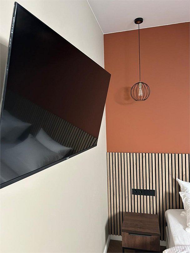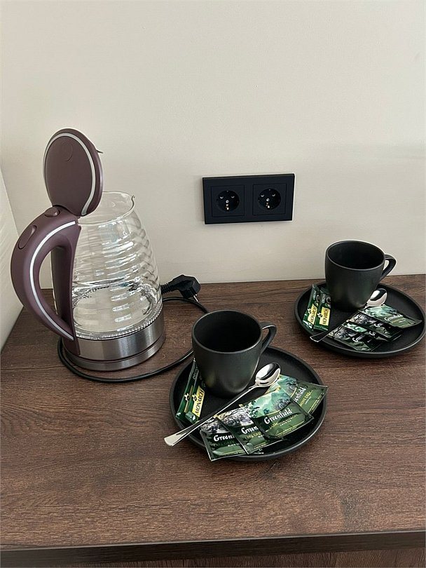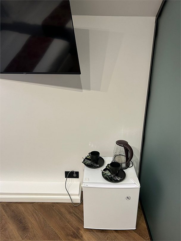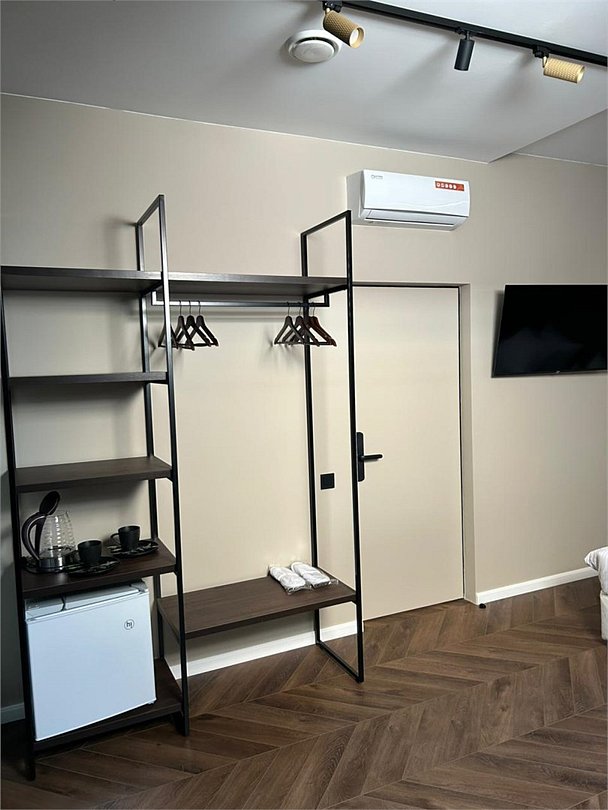 кабельное телевидение, Wi-Fi, интернет, кондиционер, светильник, фен, электронные замки, утюг, душевая кабина, теплый пол, тапочки, косметические средства, две односпальные или большая двуспальная кровать, чайный набор, чайник, унитаз, раковина, питьевая вода, отопление, кулер на этаже, вид во двор, стаканы, стул, стол, телевизор с плоским экраном, мини-холодильник, мансардные окна, уборка номера, туалетные принадлежности премиум-класса, вешалки-плечики, мыло, открытый шкаф, можно с питомцами, пеленка, кровать-трансформерВ номере