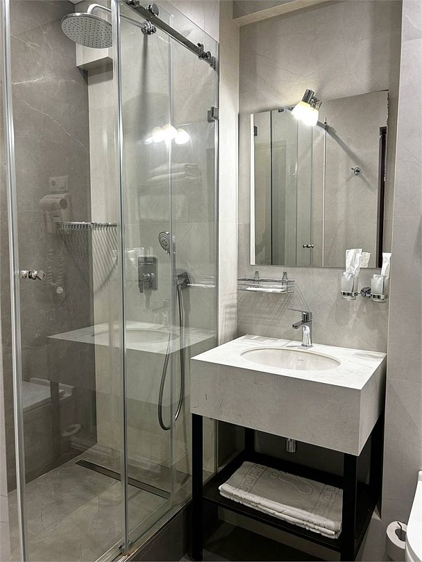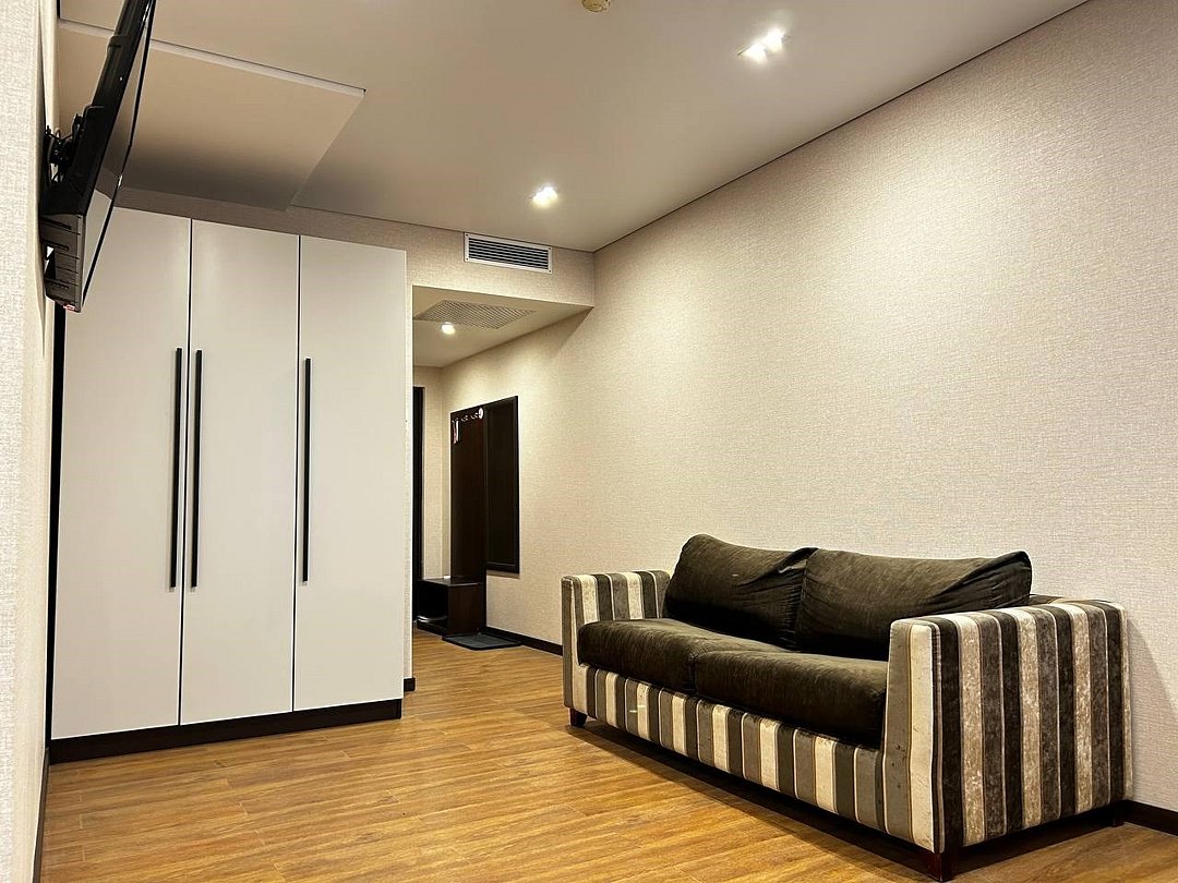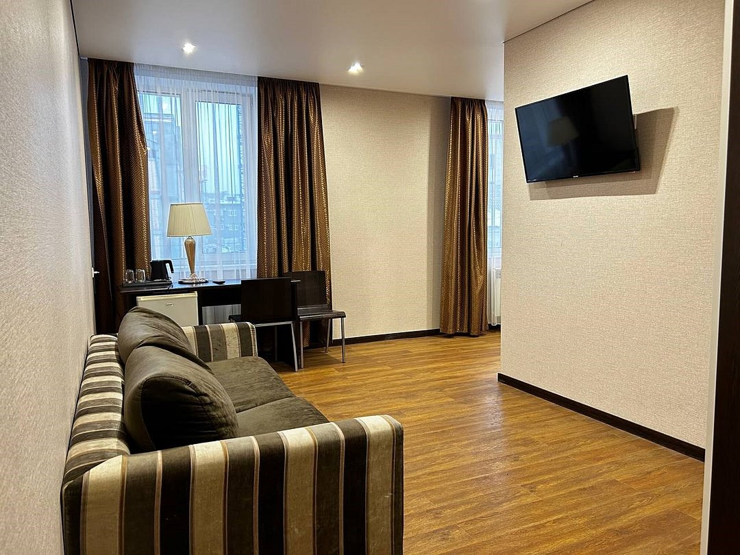 два телевизора, спутниковое телевидение, Wi-Fi, телефон, холодильник, система климат-контроля, светильник, фен, электронные замки, душевая кабина, санузел, банные принадлежности, халаты, тапочки, косметические средства, двуспальная кровать, стулья, шкаф для одежды, вешалки, письменный стол, чайный набор, отопление, вид на город, кулер на этаже, центральное кондиционирование, общая ванная комната, стаканы, без питомцевВ гостиничном номере
