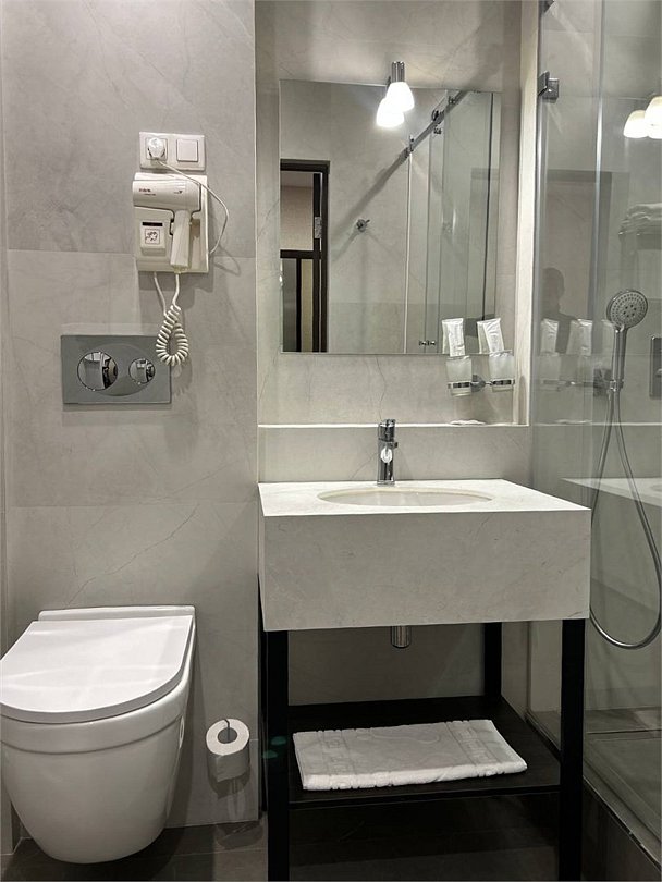телевизор, кабельное телевидение, Wi-Fi, телефон, холодильник, система климат-контроля, фен, электронные замки, душевая кабина, санузел, банные принадлежности, банные полотенца, тапочки, двуспальная кровать, стулья, шкаф для одежды, вешалки, письменный стол, сейф, раковина, вид на город, кулер на этаже, центральное кондиционирование, вид во двор, шапочка для душа, без питомцевВ гостиничном номере