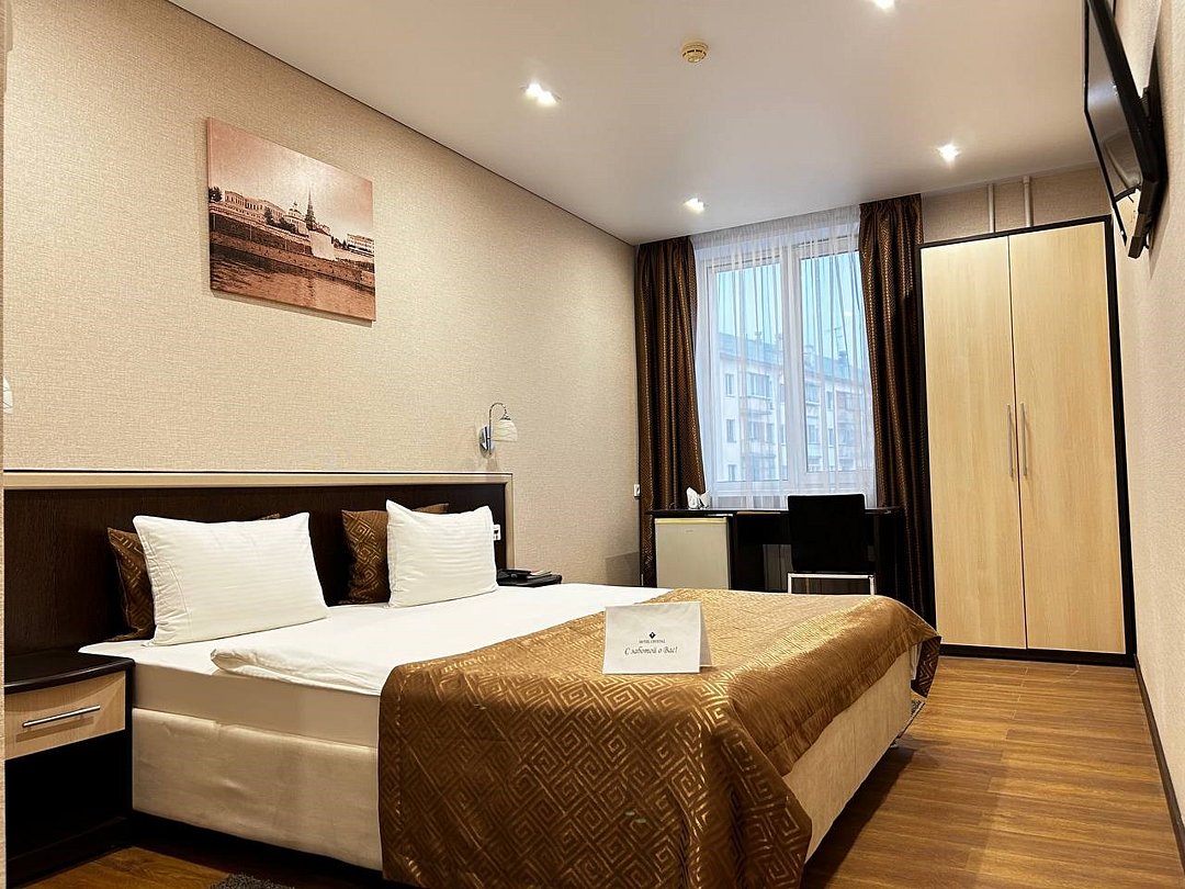 Номер стандартной категории с одной большой кроватью — номер, обеспечивающий комфорт и удобство для вашего пребывания в Казани. Основные характеристики номера: - Удобства: Двуспальная кровать с белоснежным постельным бельём, оборудованное рабочее место, платяной шкаф и сейф — идеально для отдыха и работы. - Техническое оснащение: Индивидуальная система кондиционирования, ЖК-телевизор, бесплатный Wi-Fi и холодильник — чтобы вы чувствовали себя комфортно в любое время. - Ванная комната: Современная душевая кабина, фен, косметические принадлежности и тапочки — для свежести и релакса после дня. Этот номер предлагает комфорт и функциональность для вашего незабываемого отдыха в Казани.Услуги и удобства