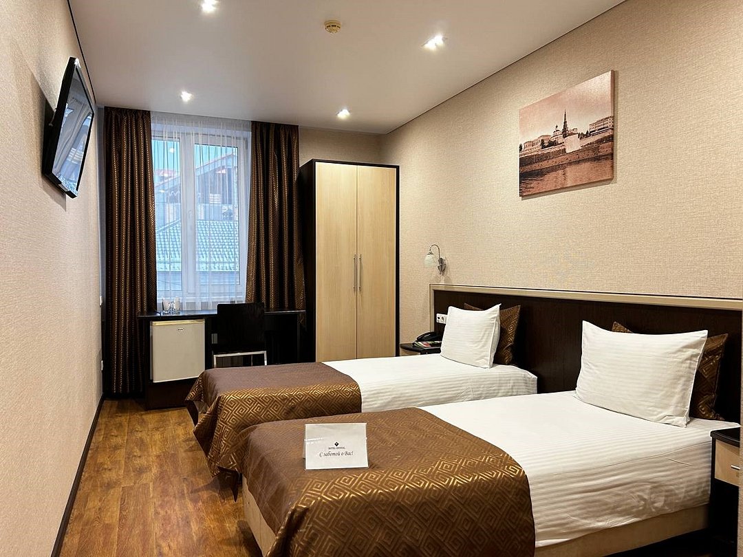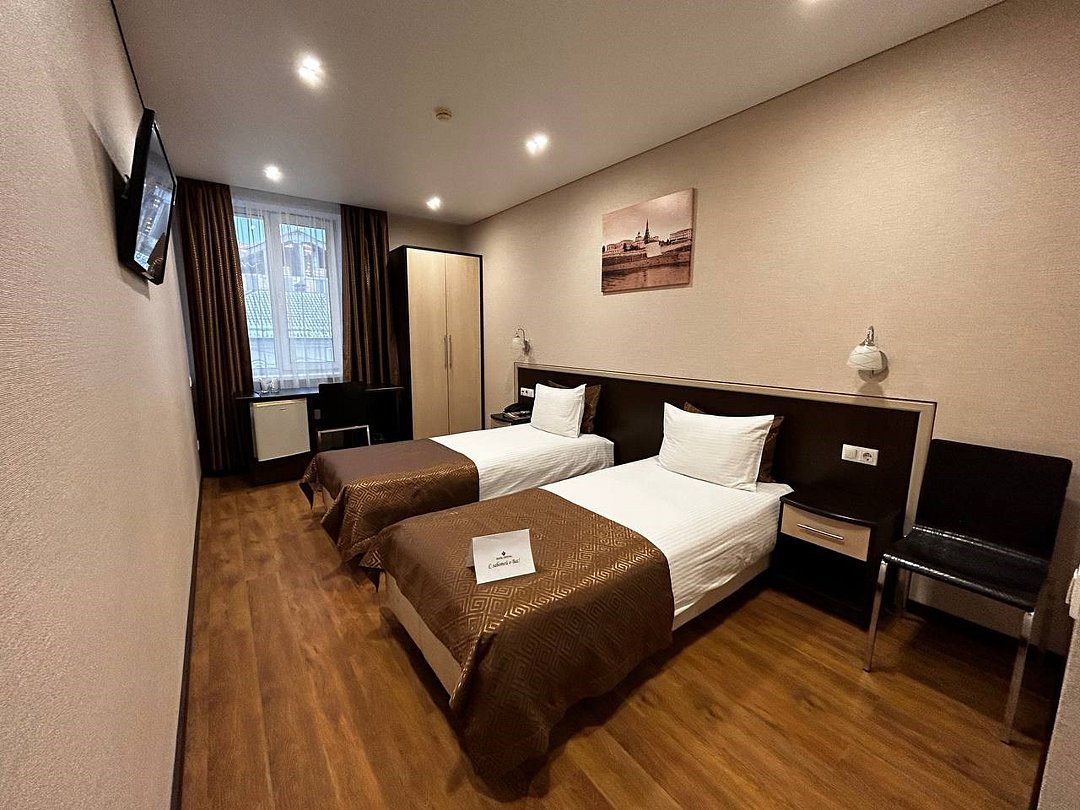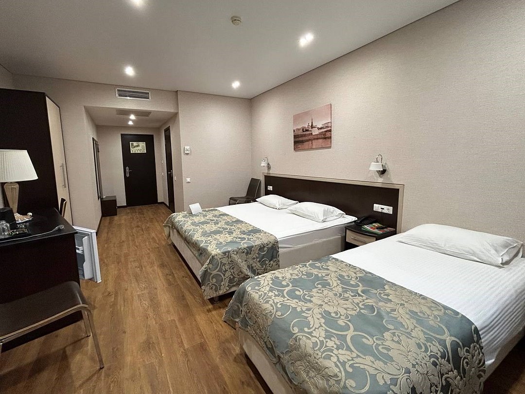 Номер стандартной категории с двумя односпальными кроватями — номер, обеспечивающий комфорт и удобство для вашего пребывания в Казани. Основные характеристики номера: - Удобства: Две односпальные кровати с белоснежным постельным бельём, оборудованное рабочее место, платяной шкаф и сейф — идеально для отдыха и работы. - Техническое оснащение: Индивидуальная система кондиционирования, ЖК-телевизор, бесплатный Wi-Fi и холодильник — чтобы вы чувствовали себя комфортно в любое время. - Ванная комната: Современная душевая кабина, фен, косметические принадлежности и тапочки — для свежести и релакса после дня. Этот номер предлагает комфорт и функциональность для вашего незабываемого отдыха в Казани.Услуги и удобства